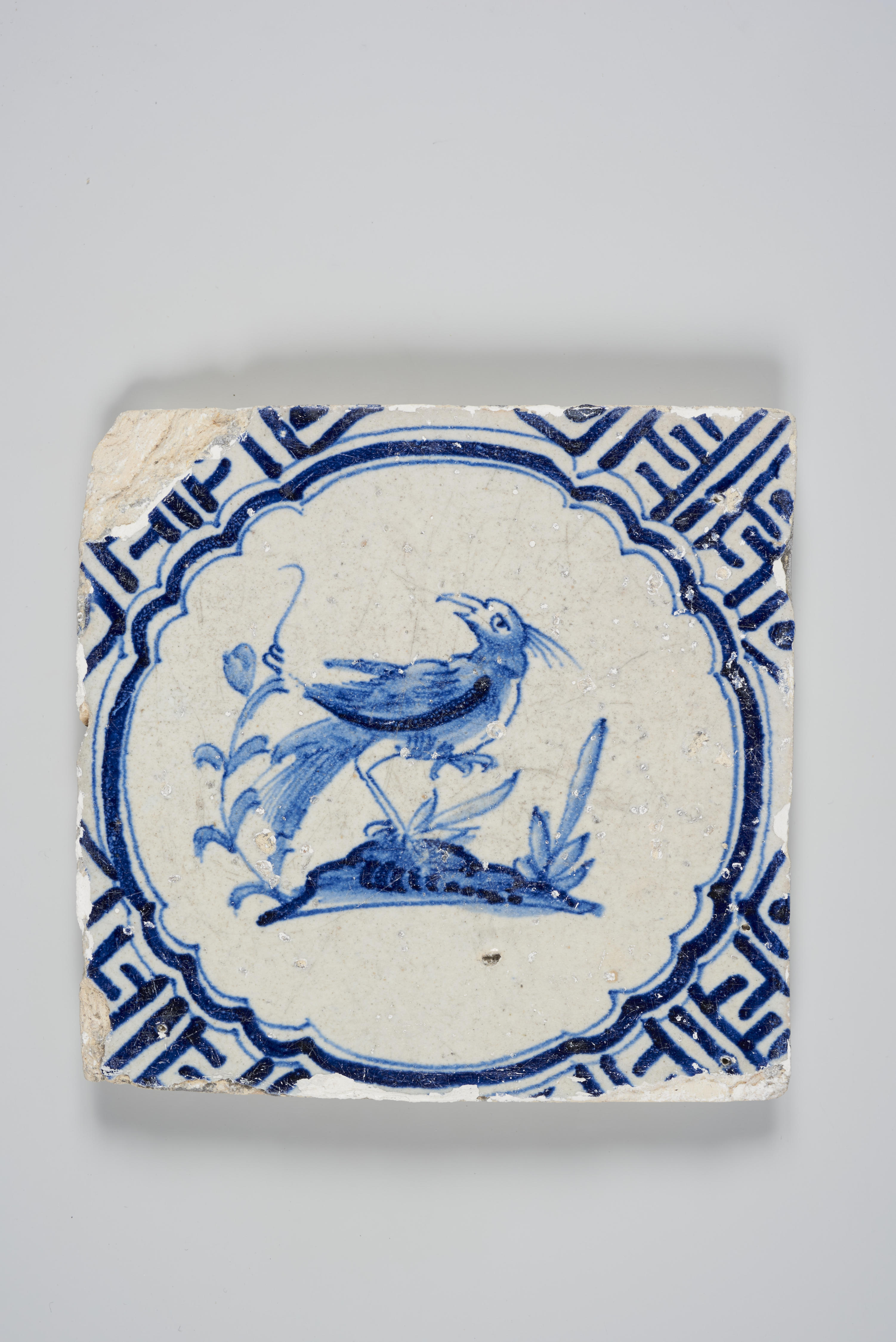 Wandtegel met een afbeelding van een vogel in een geschulpte omlijsting; blauw; hoekmotief: meanders.