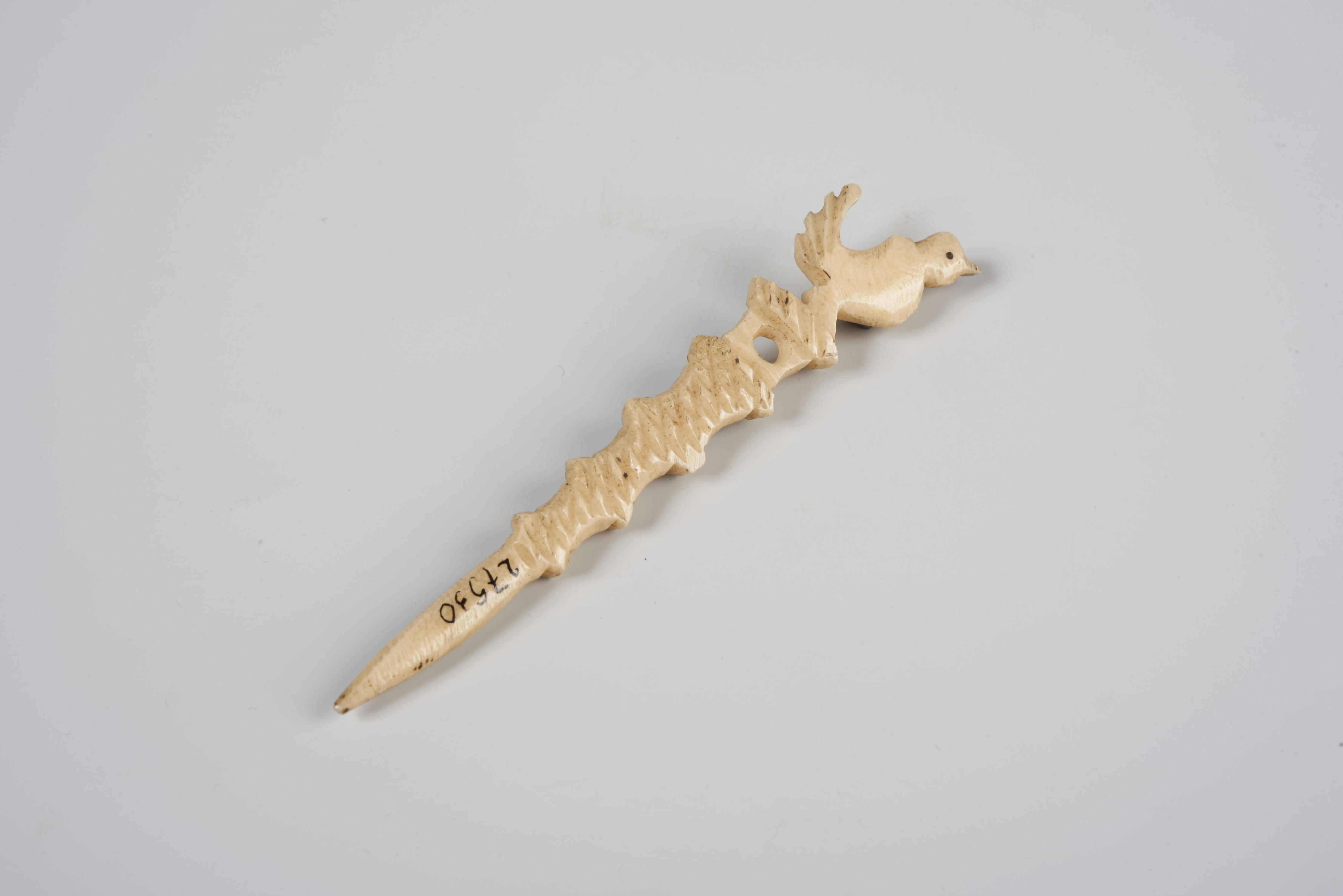 Benen pijpenstoker, versierd met een vogeltje op een voetstuk. Het onderste deel van de pijpenstoker loopt uit in een ronde priem met spitse punt.