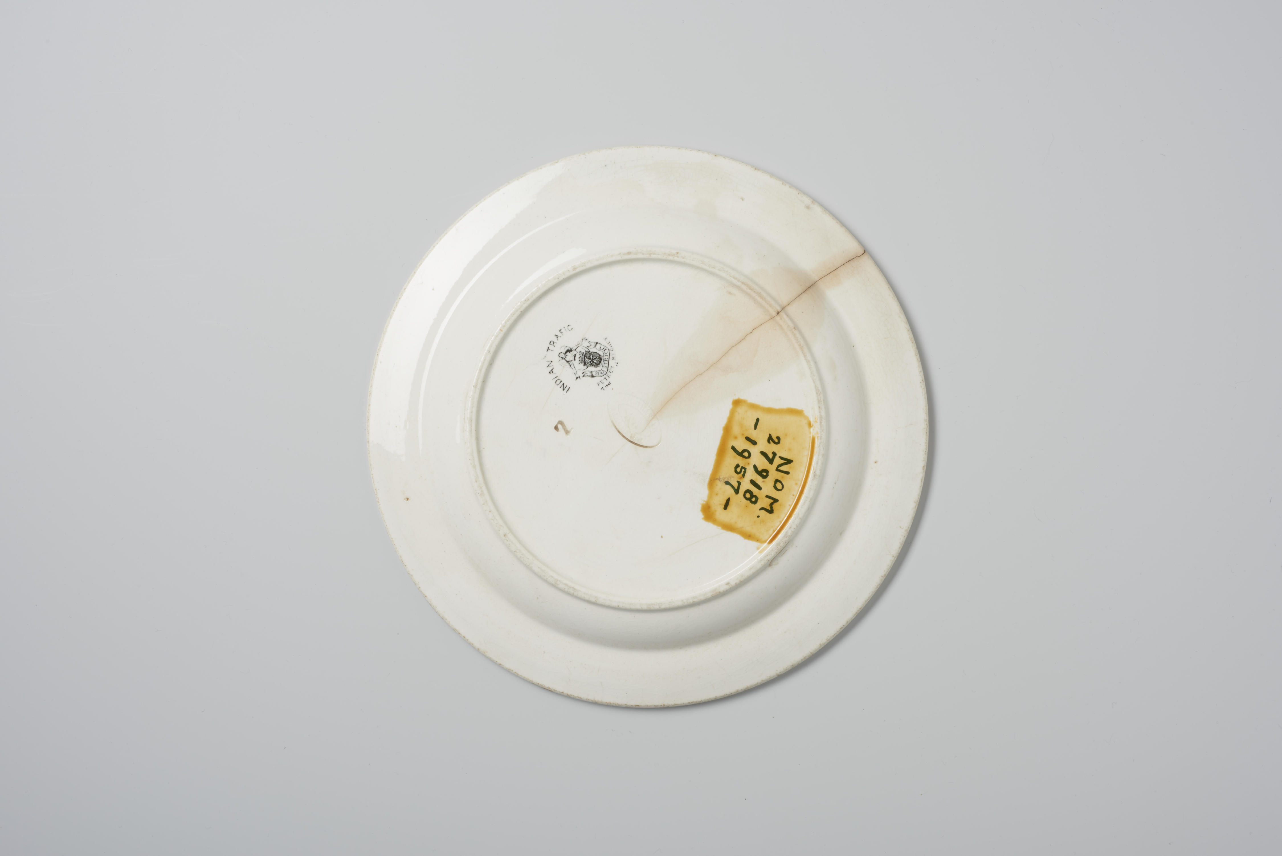 Bord van Engels aardewerk met de voorstelling van een man te paard die een vogel aan een vrouw geeft. Achter de vrouw staat een kind. Op de straat zijn meerdere mannen en vrouwen te zien.
