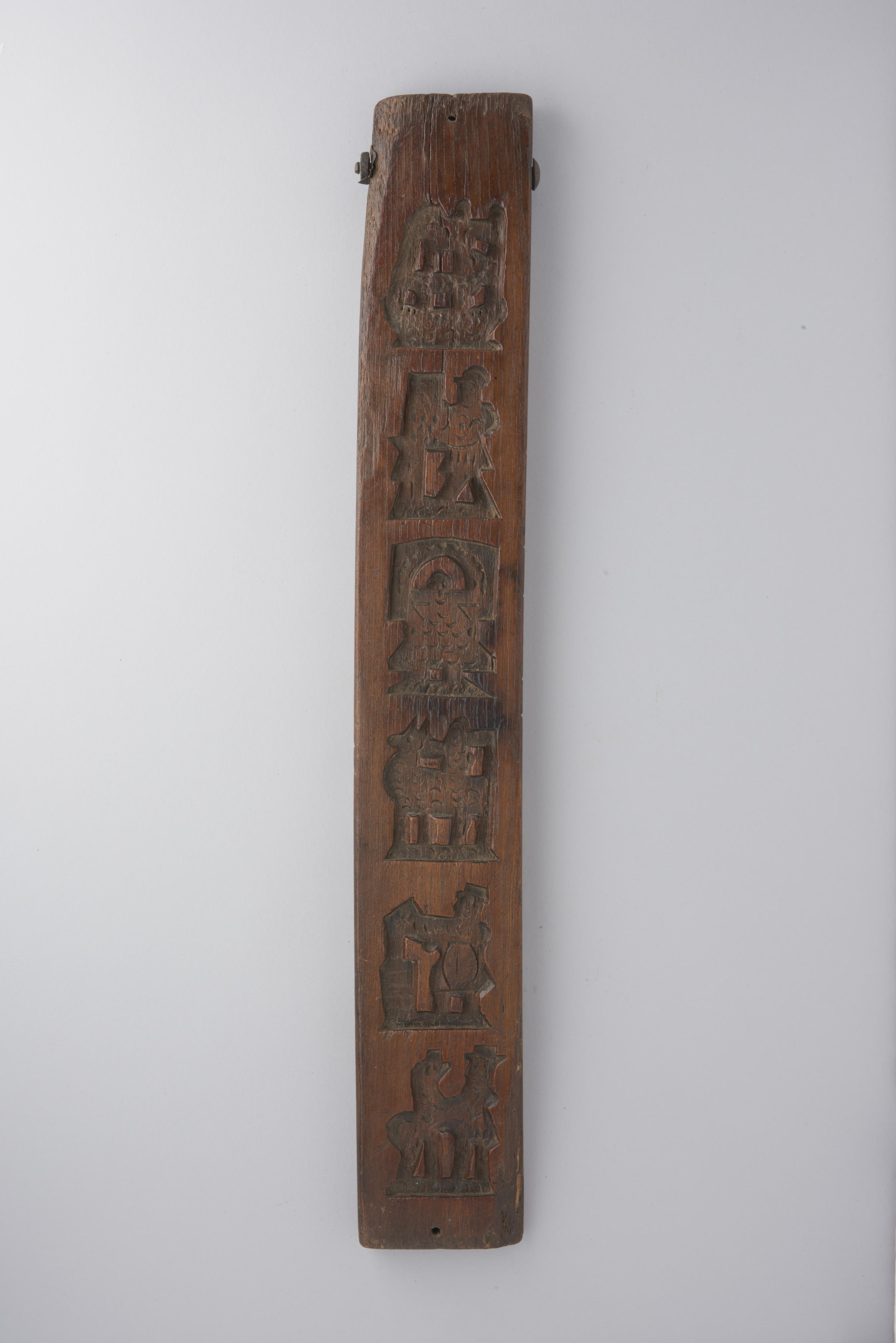 Essenhouten koekplank, aan één zijde besneden met zes voorstellingen, waaronder een zeilschip.