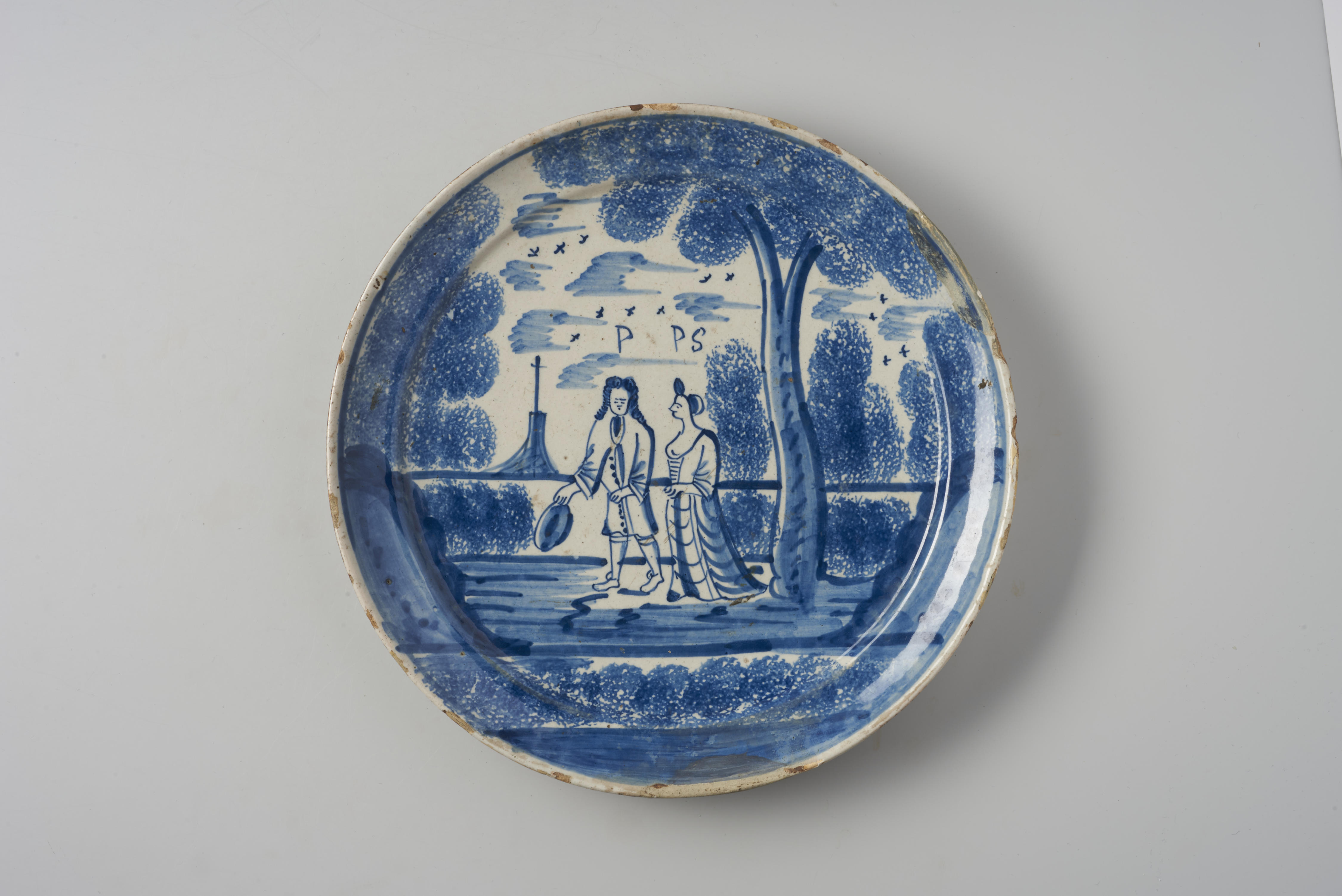 Bord met een voorstelling van een man en vrouw in een park met bomen en vogels in de lucht. Boven de man staat de letter 'P'; boven de vrouw staan de letters 'PS'. De figuren stellen waarschijnlijk respectievelijk prins Willem IV en zijn vrouw, prinses Anna van Hannover, voor.