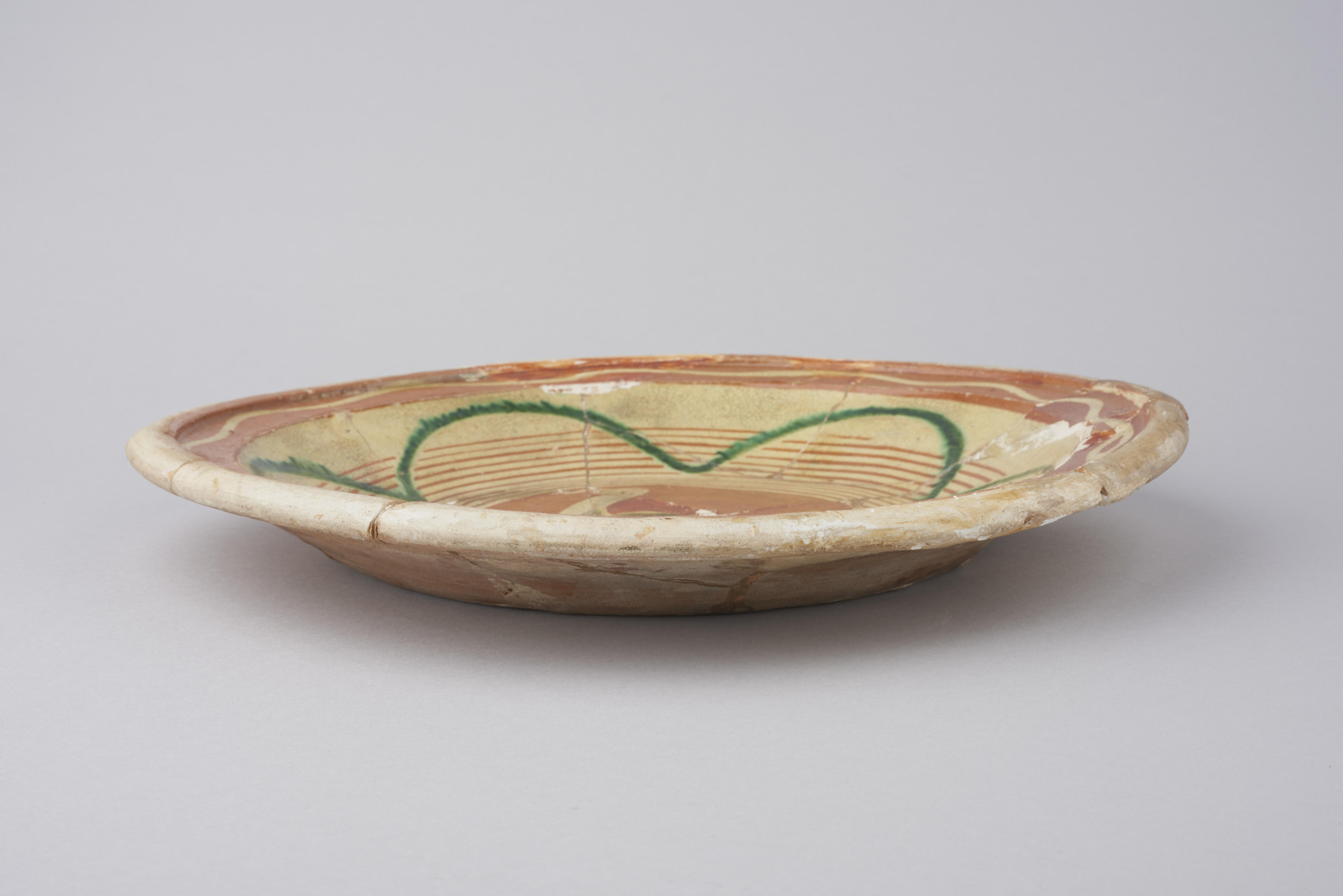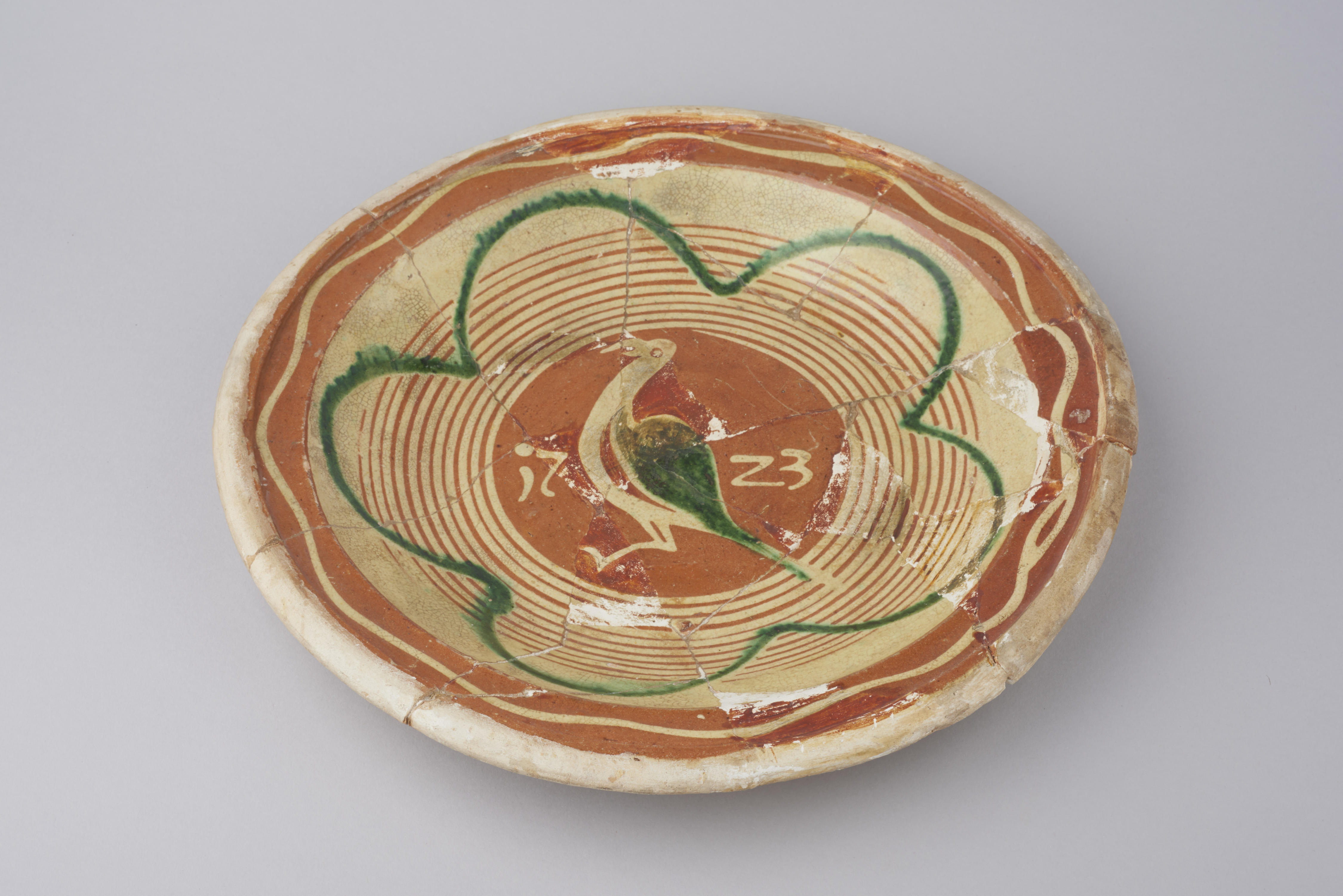 Schotel, bodemvondst in Deventer. De schotel heeft een voorstelling van een vogel en het jaartal 1723.