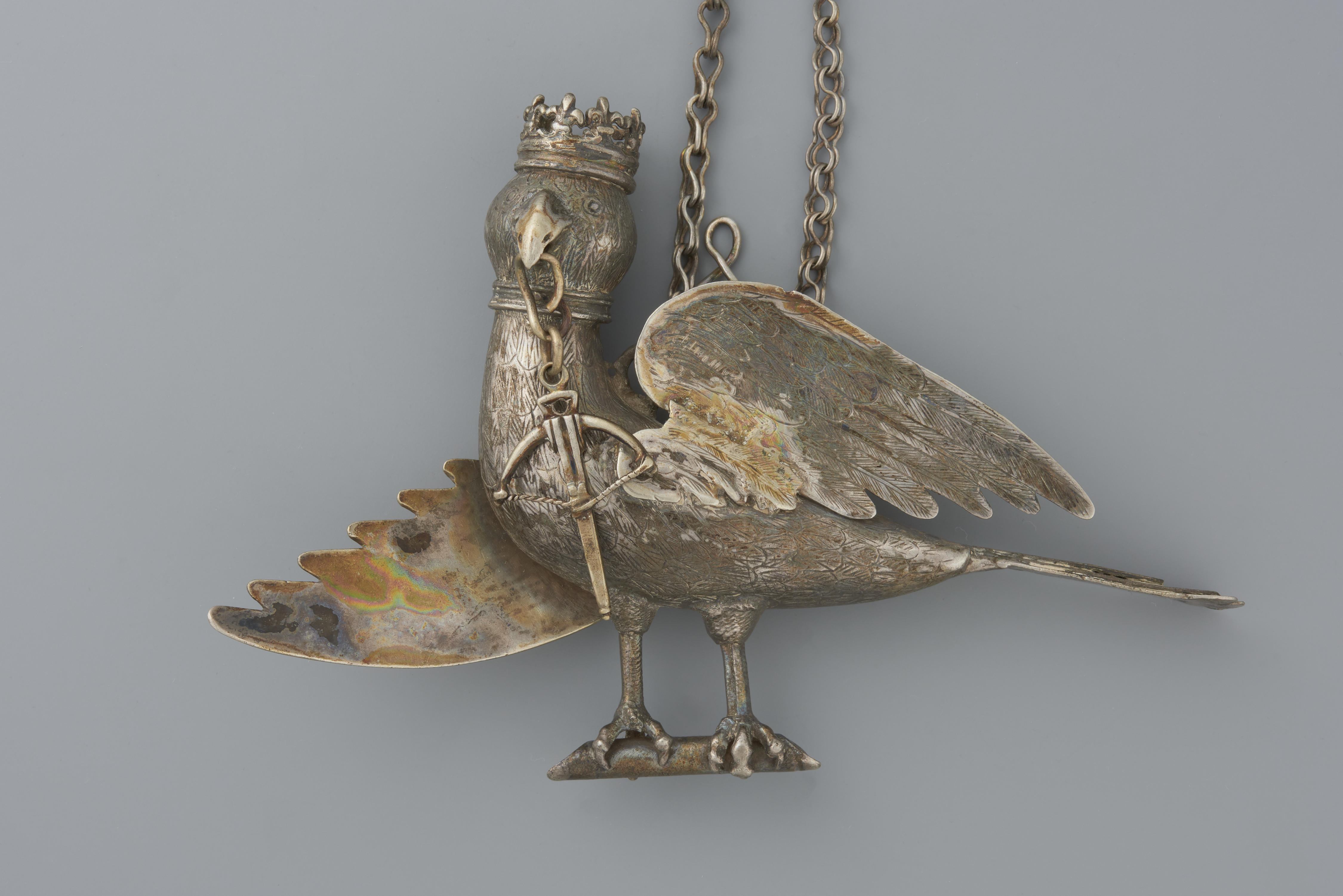 Gekroonde zilveren schuttersvogel aan een ketting. De vogel heeft een gespannen kruisboog in zijn bek.