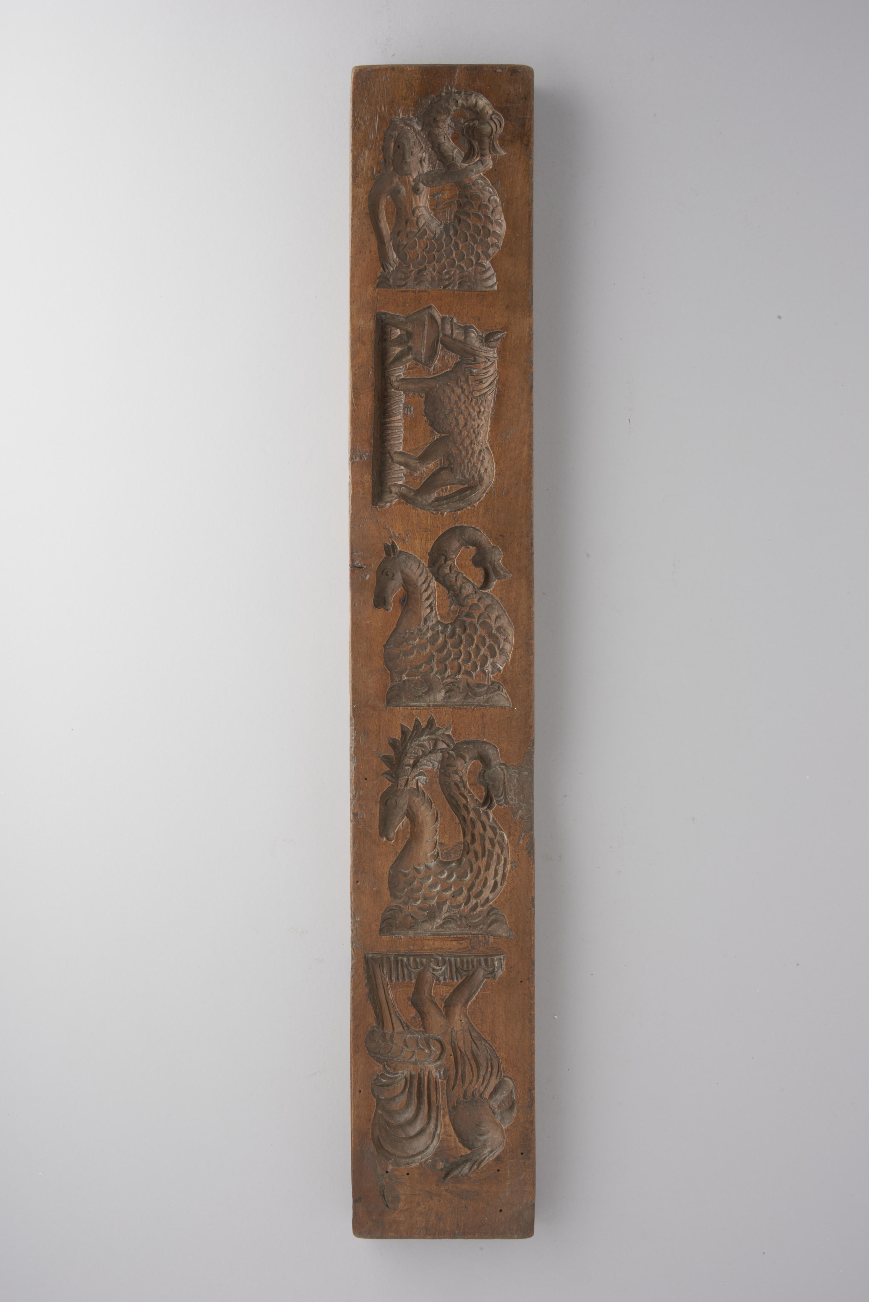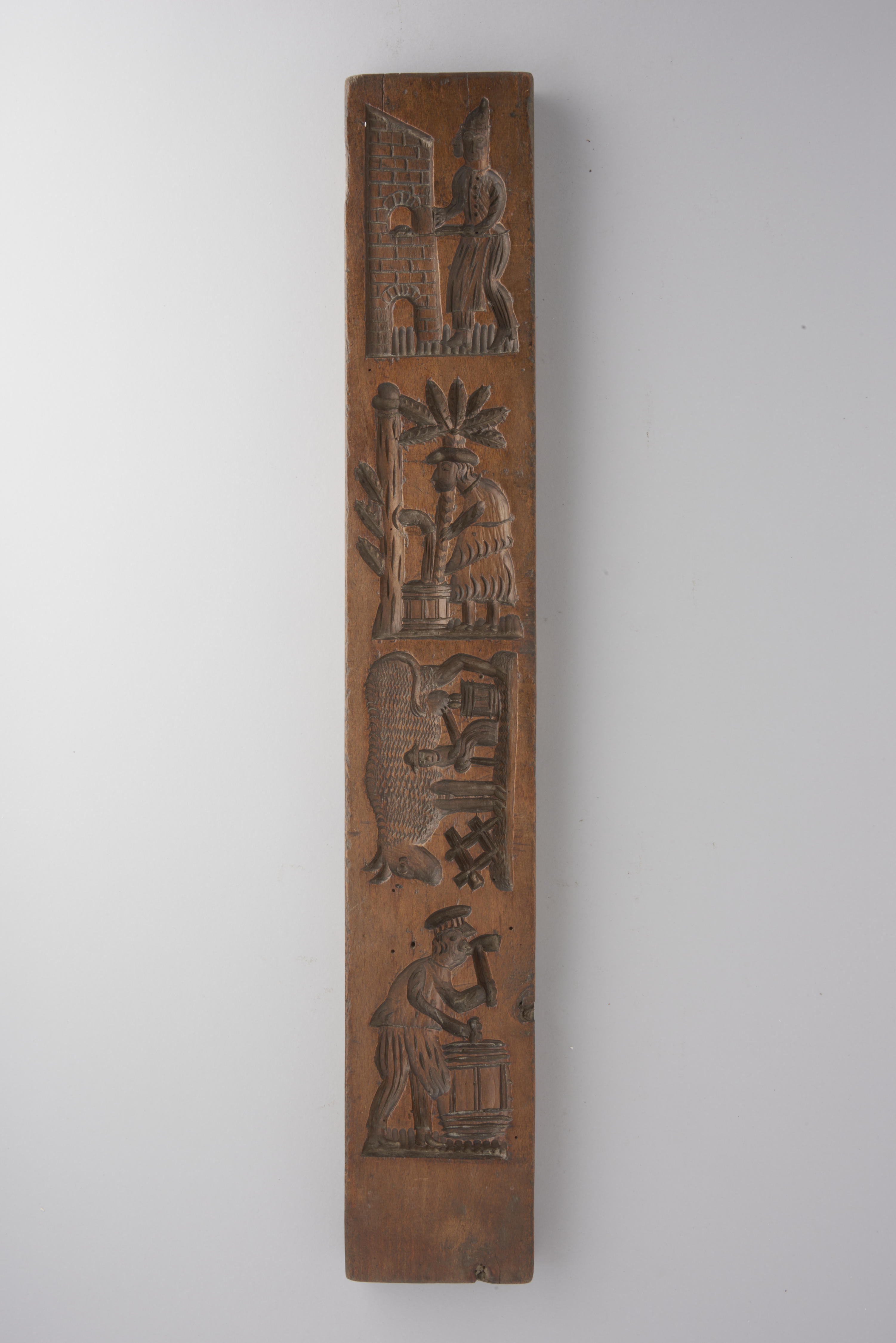 Beukenhouten koekplank. De plank is aan één zijde besneden met vijf voorstellingen, waaronder een aantal fabeldieren. De andere zijde van de plank is besneden met vier voorstellingen, waaronder een koe die gemolken wordt.