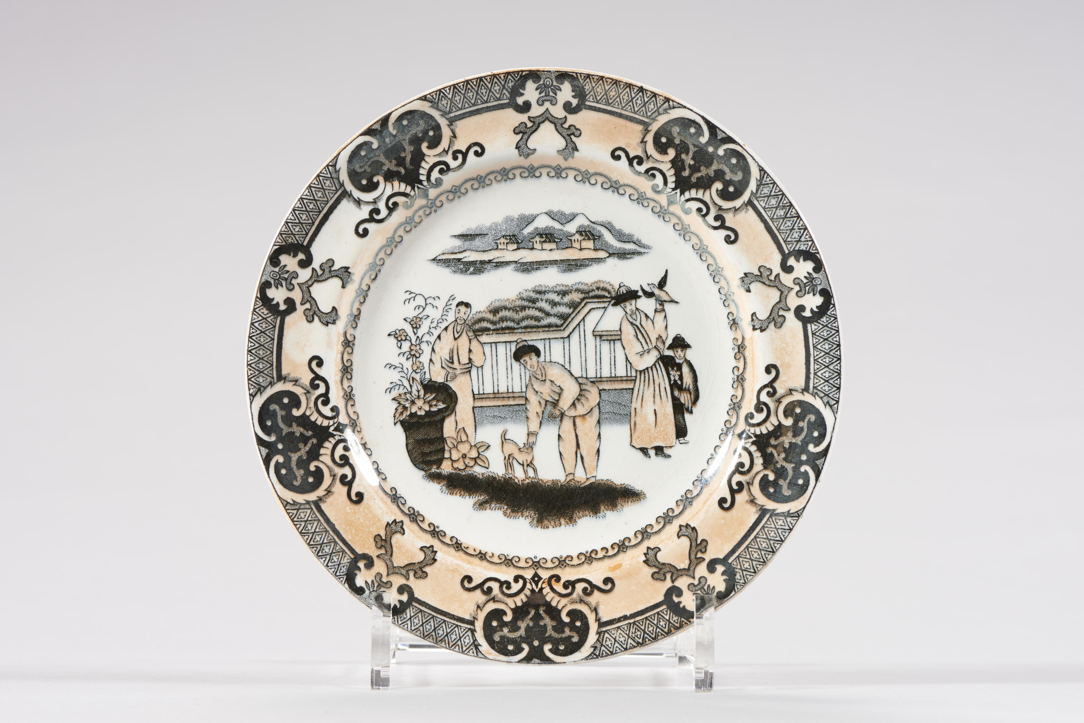 Bord van Engels aardewerk met op het middenvlak een voorstelling van vier mensfiguren in een tuin. De tweede figuur van rechts heeft een vogel op de hand. De figuur in het midden aait een hond. Op de achtergrond zijn gebouwen en bergen te zien.