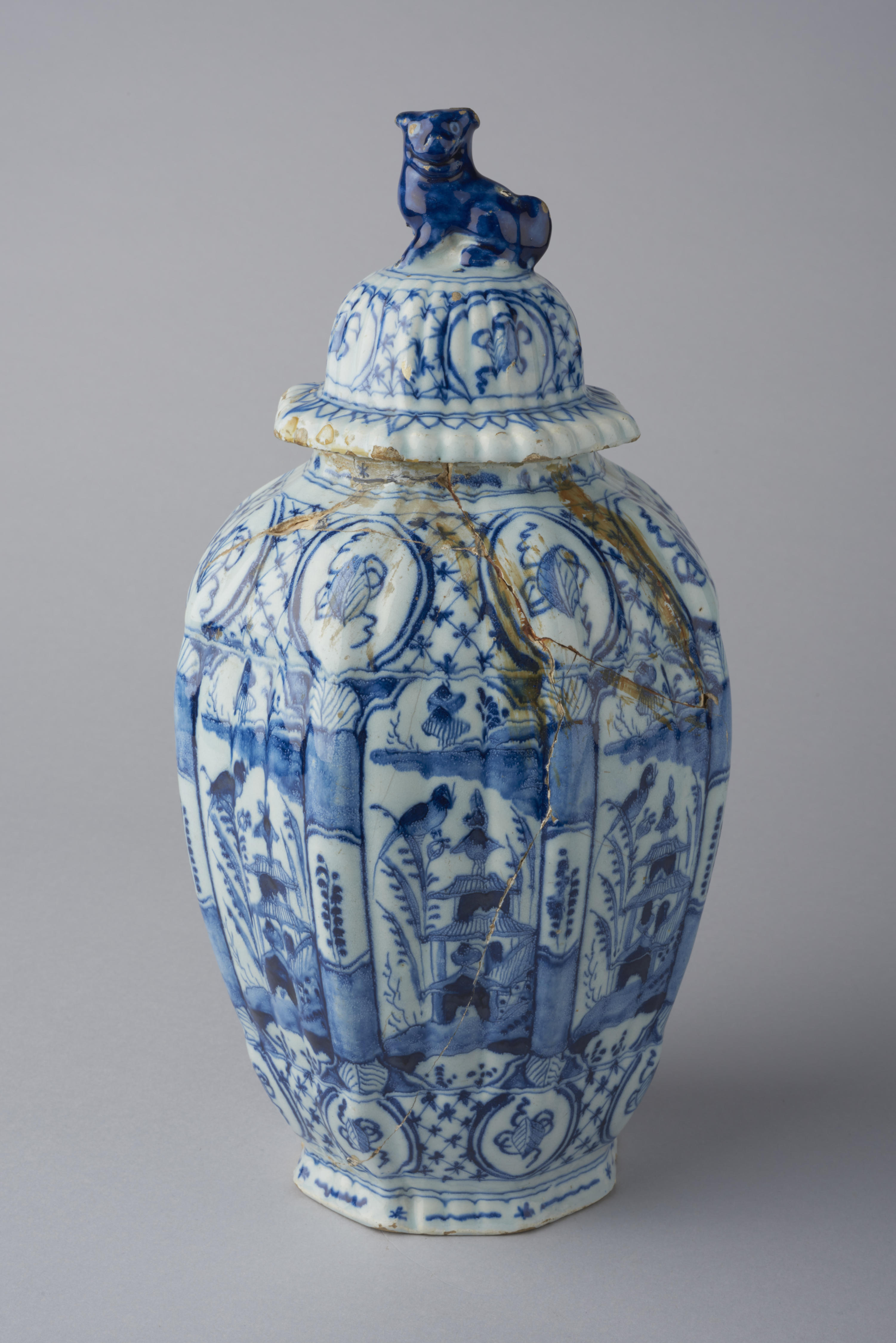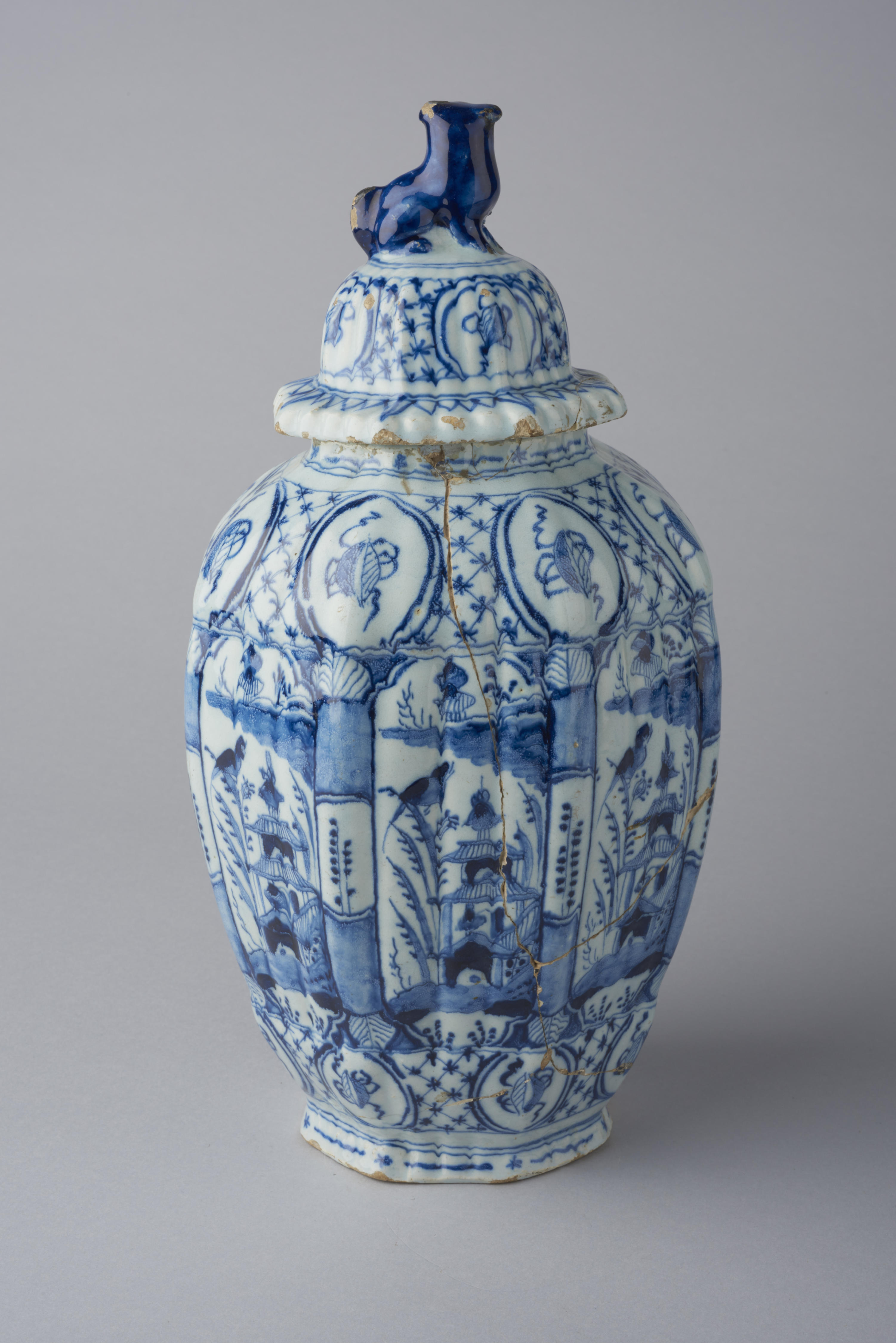 Kastvaas, versierd met voorstellingen van een pagode met een vogel, artemisiabladeren en geometrische ornamenten. Het deksel is bekroond met een hondje.