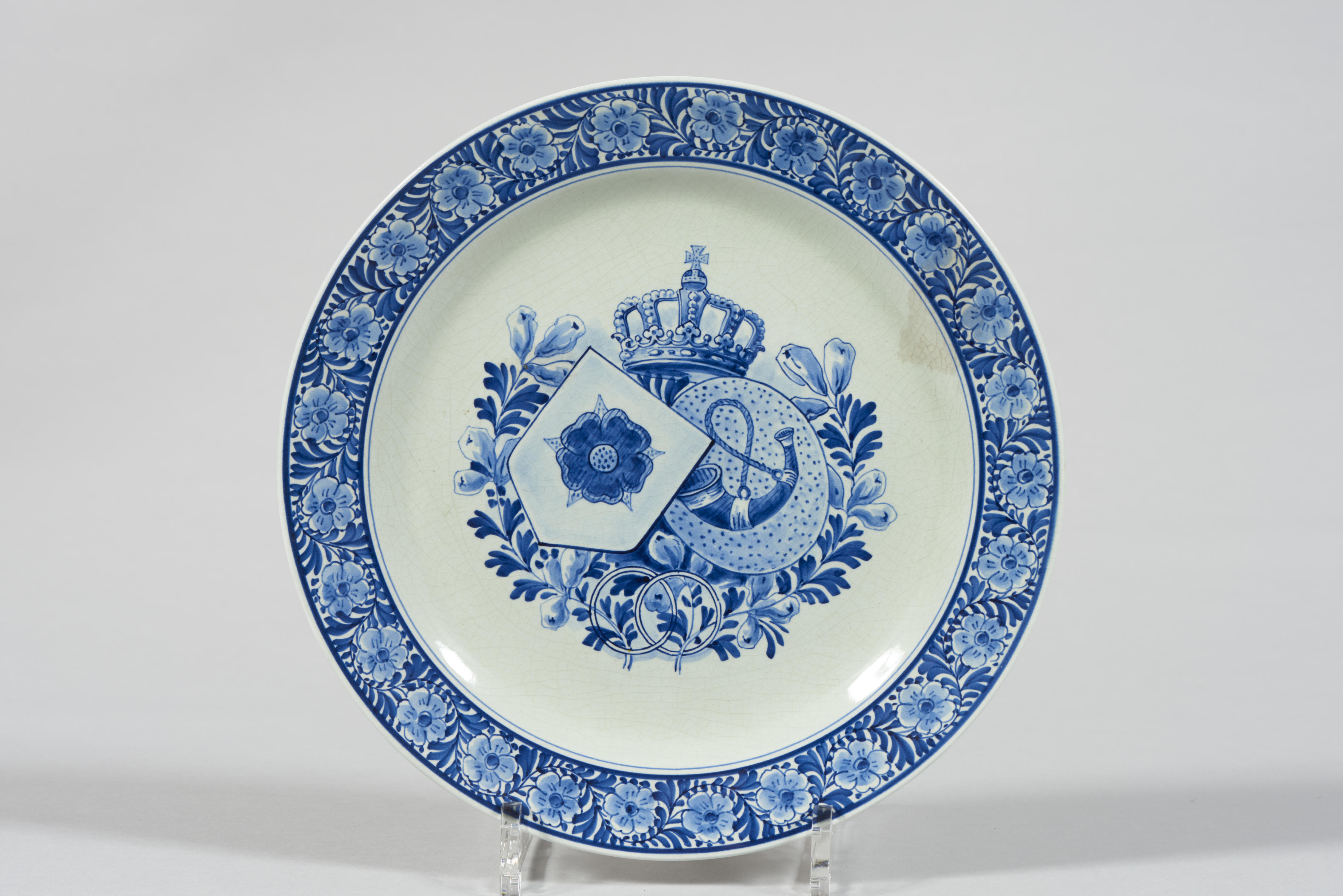Gedenkbord, uitgebracht ter gelegenheid van het huwelijk van prinses Juliana en prins Berhard. Op het midden van het bord staan twee schilden onder een kroon afgebeeld. Op het ene schild staat een bloem en op het andere schild staat een hoorn afgebeeld. De schildjes liggen op bladertakken met twee ringen aan de onderzijde. De rand ...
