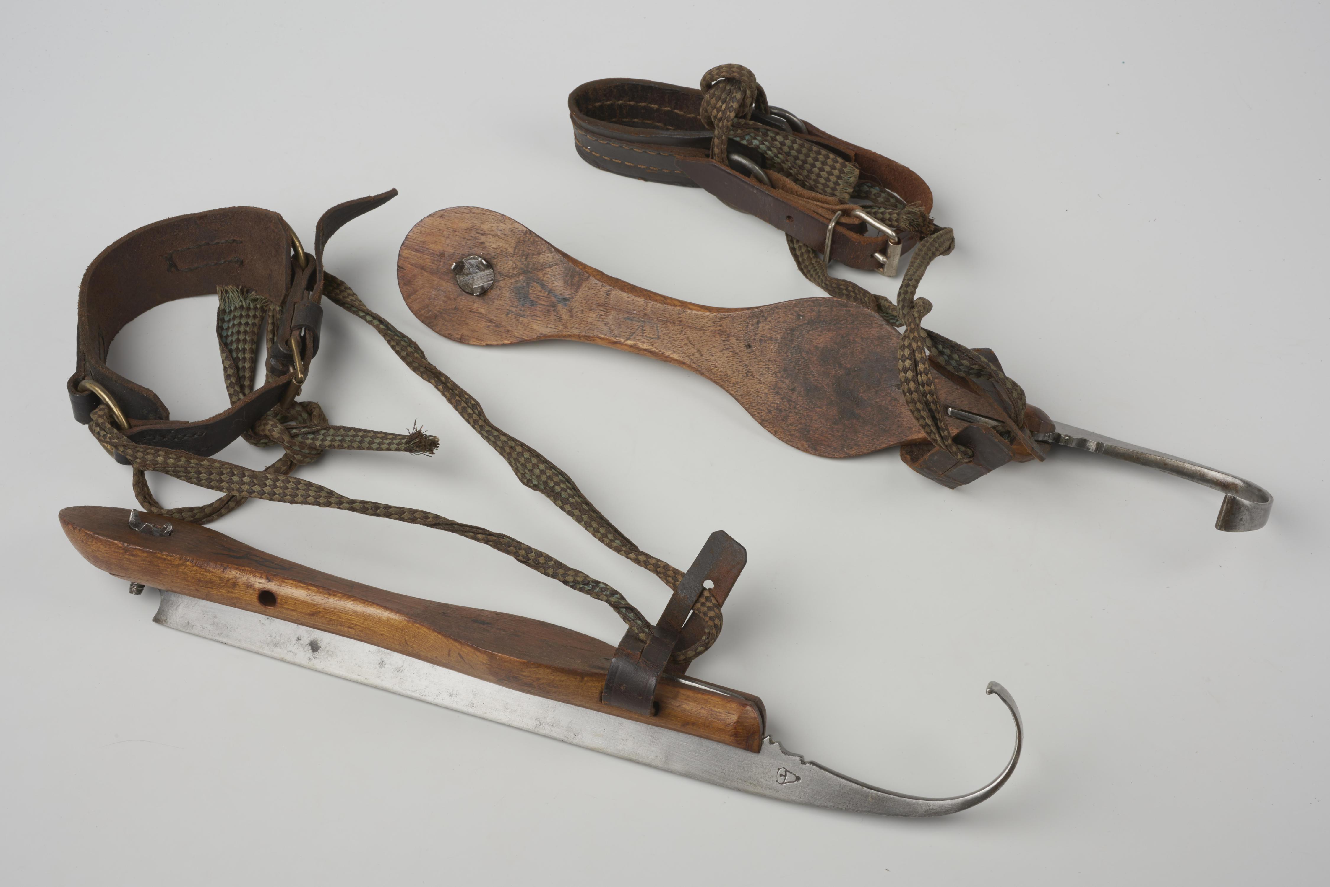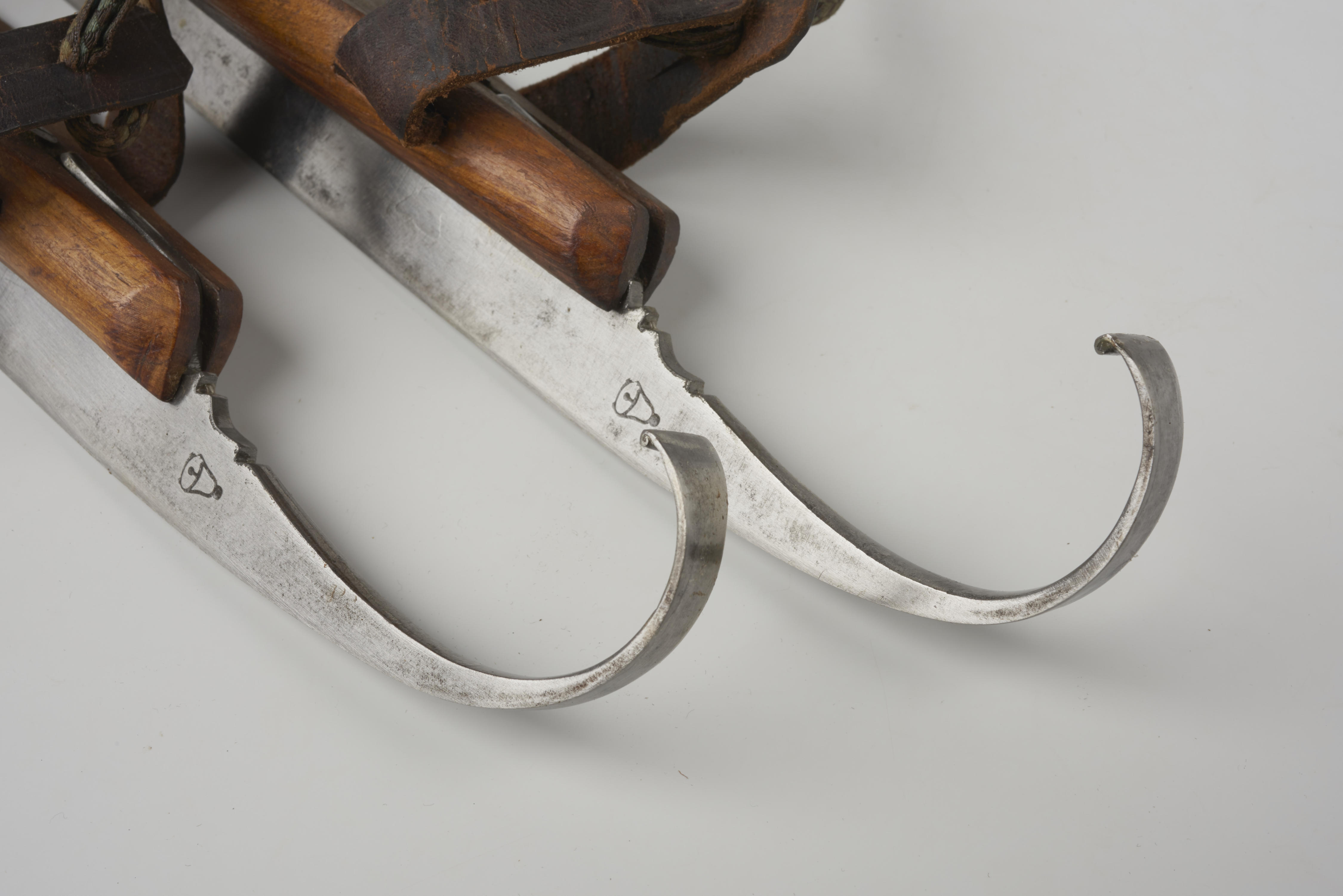 Paar schaatsen met een merkteken in de vorm van een bel, gemaakt in Duitsland.