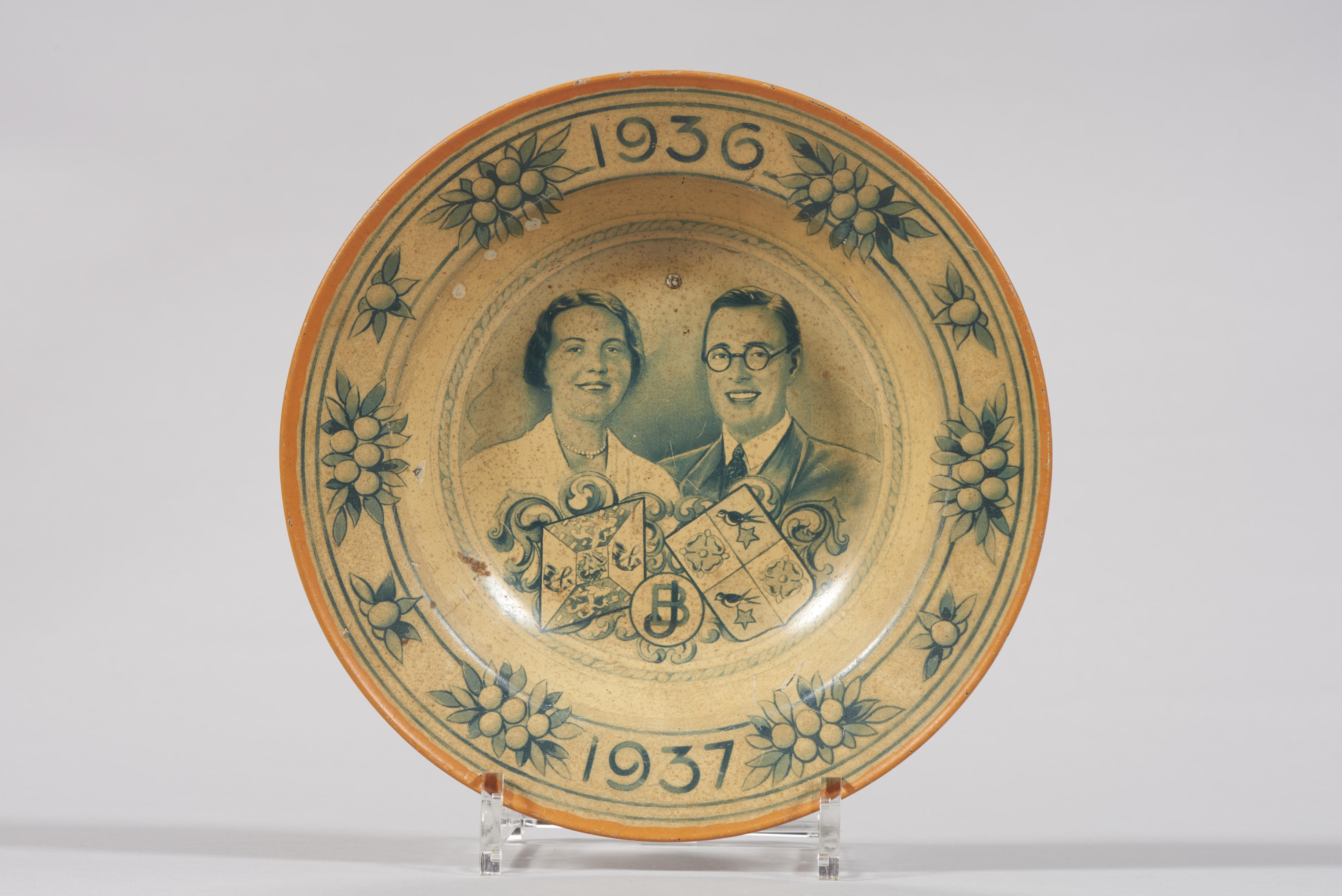 Gedenkbord, geproduceerd door Mosa in Maastricht ter gelegenheid van het huwelijk van prinses Juliana en prins Bernhard in 1937.