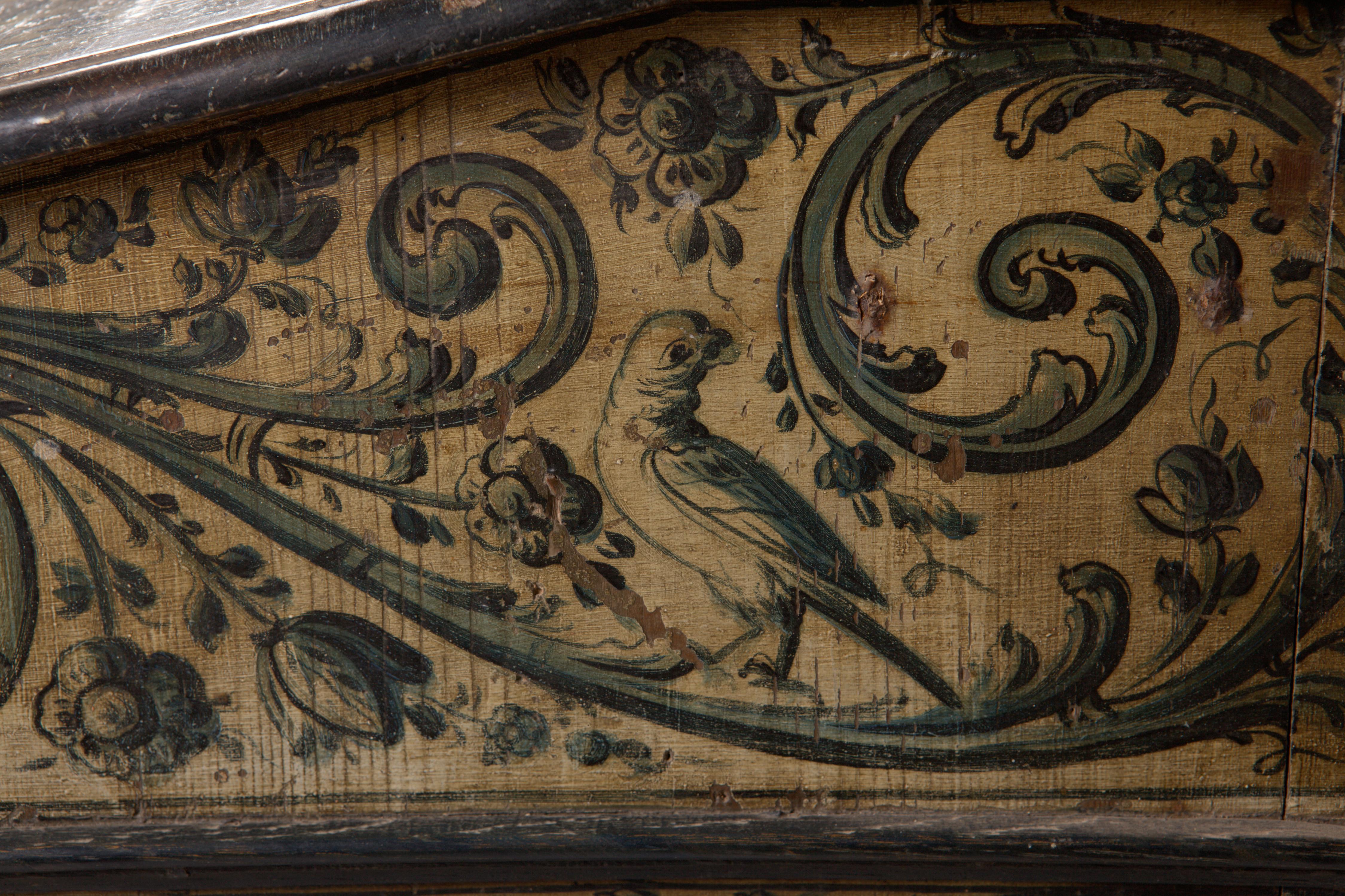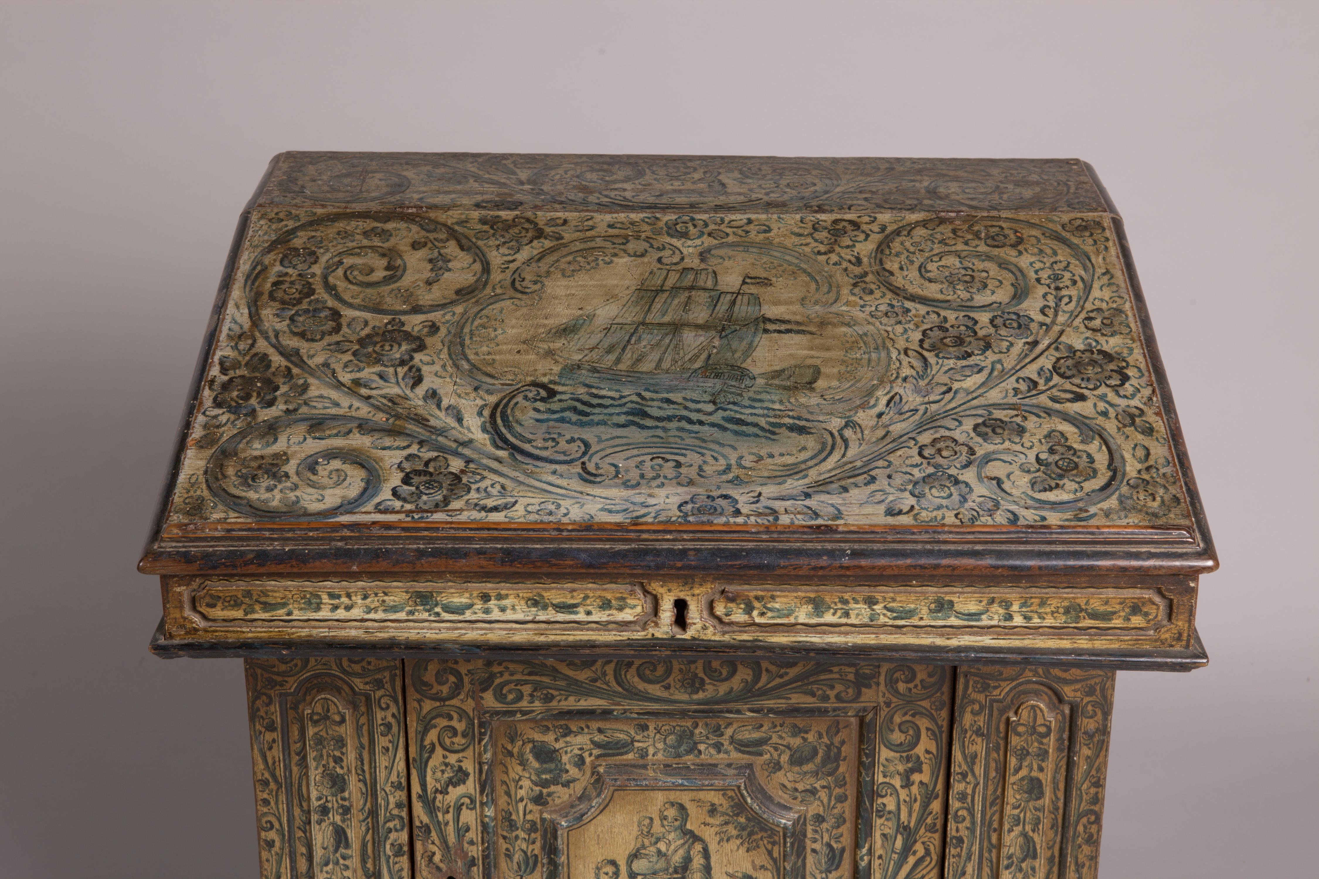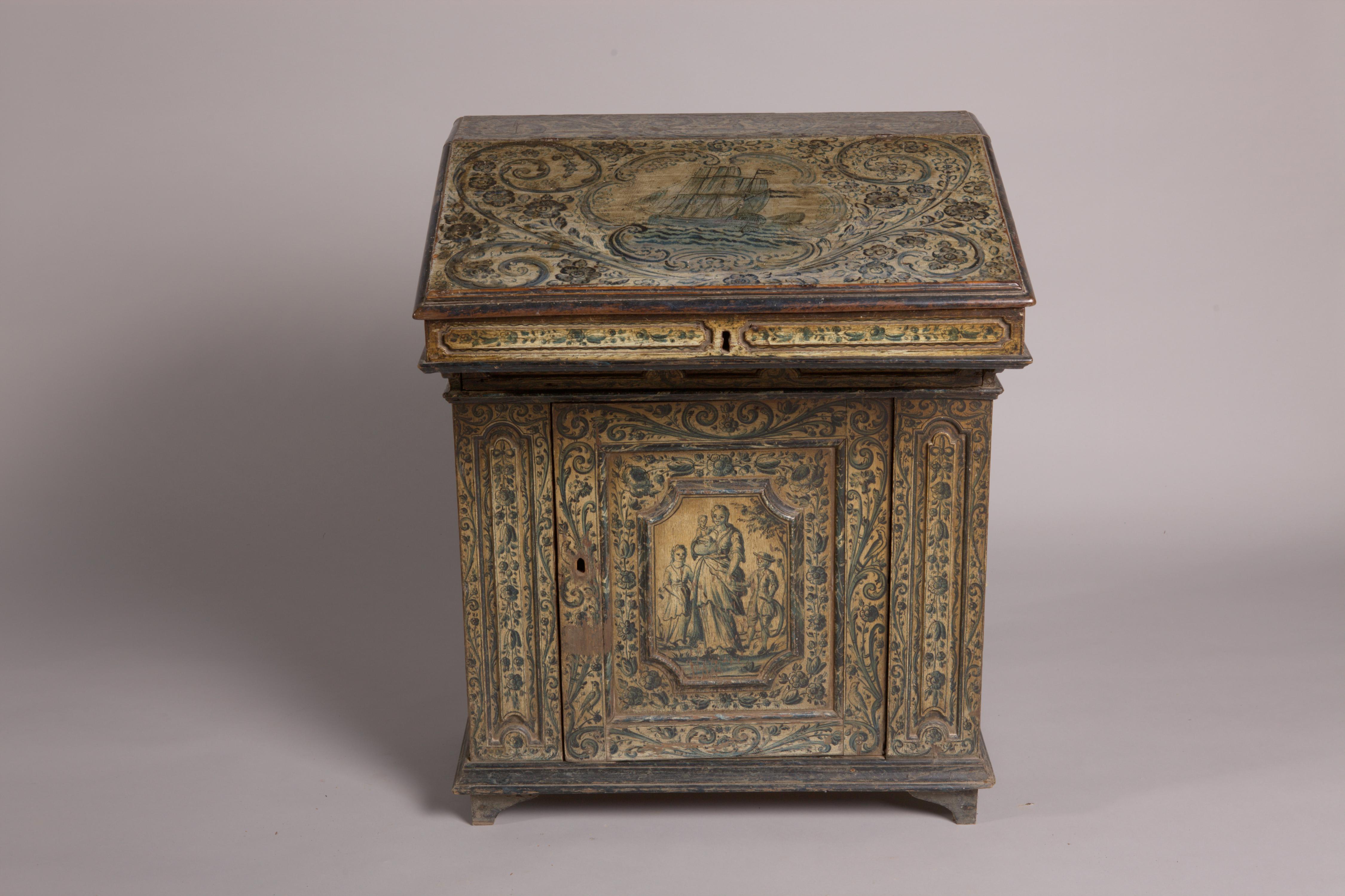 Lessenaar, aan de buitenzijde beschilderd met een ecrukleurig fond met daarop acanthusbladen, bloemen en festoenen. Op de deur is een vrouw met een kind op de arm en aan weerszijden een jongen en meisje aan haar rok afgebeeld. Op de klep is een zeilschip te zien, op de linkerzijde een vrouw met aan haar voeten ...