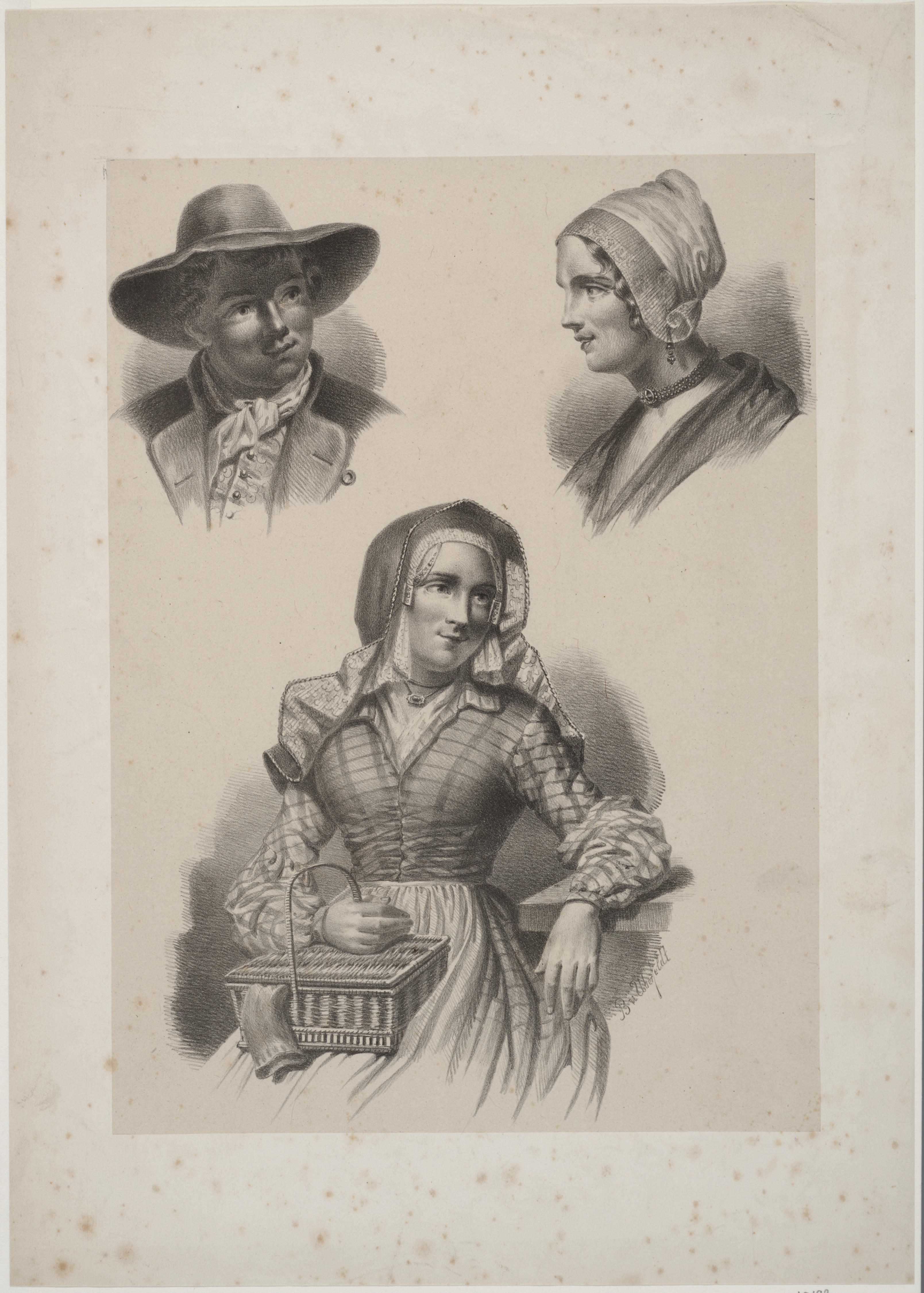 Prent met het portret van een man met een hoed, een vrouw met een hul en een Noord-Hollandse vrouw met op schoot een mandje met een breikous.