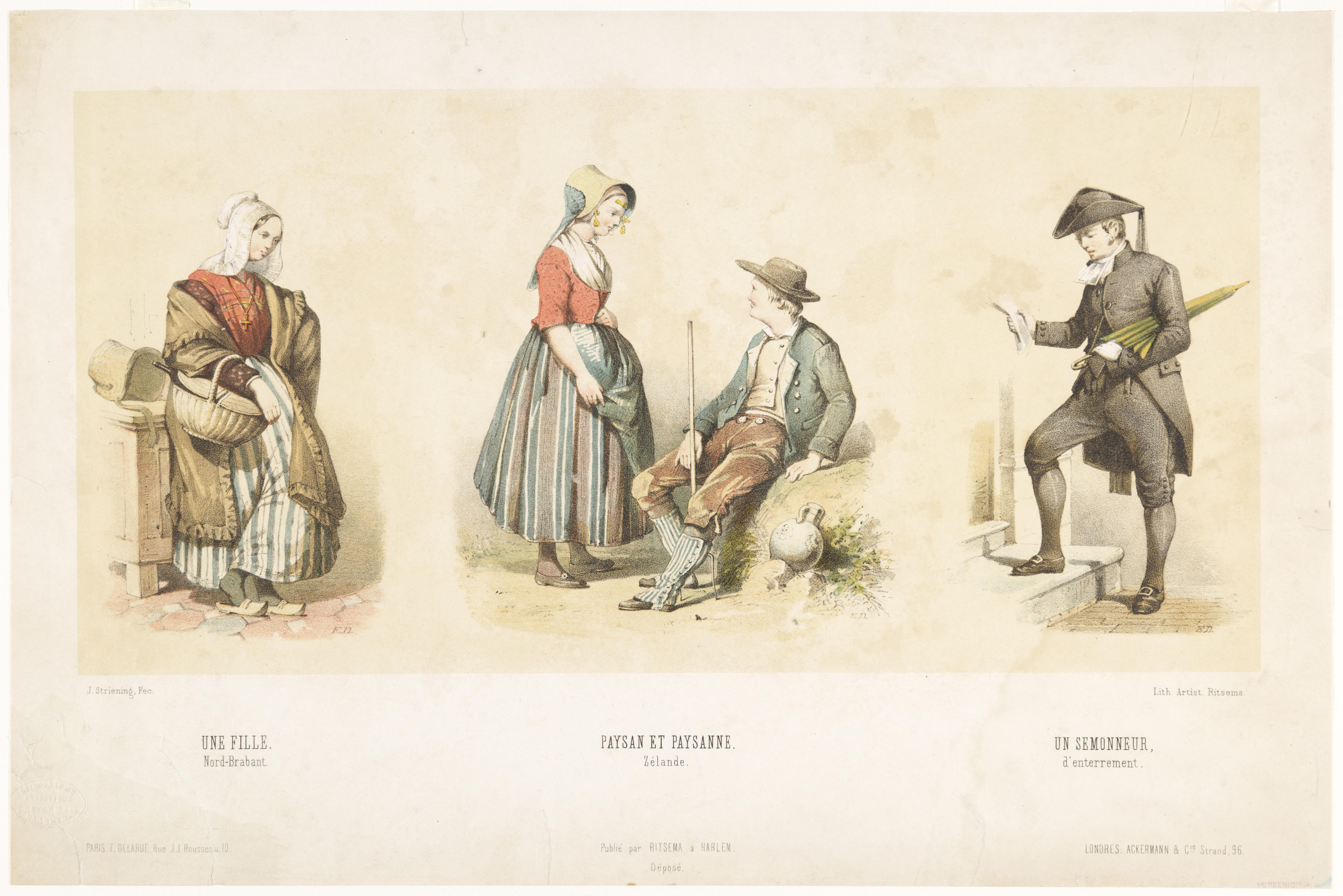 Prent met drie afbeeldingen: een meisje uit Noord-Brabant, een Zeeuwse boerin en boer en een aanspreker.