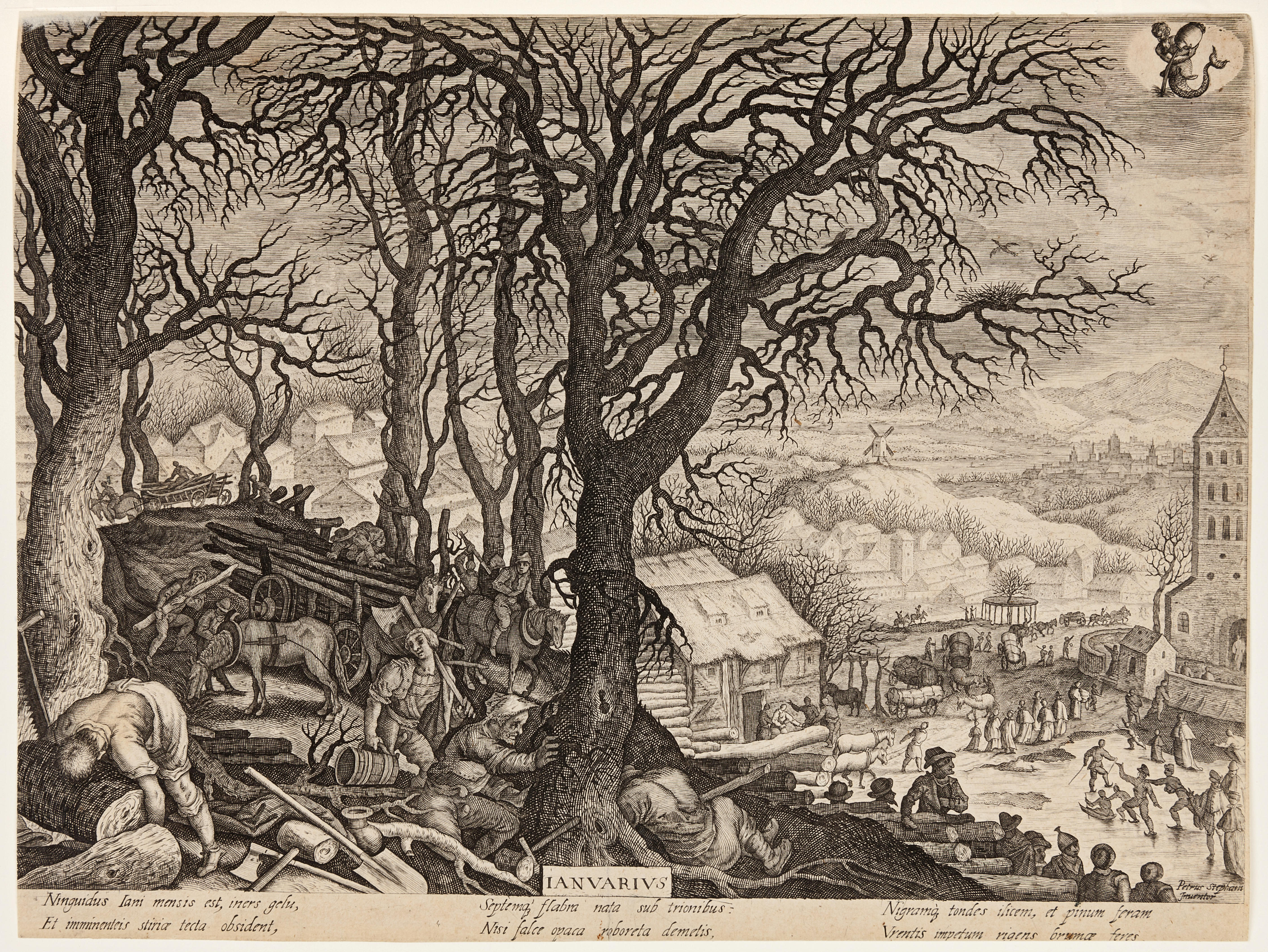Op de prent is een allegorie van de maand januari (Ianuarius) verbeeld. De afbeelding toont een boslandschap en een schaatsenrijdend gezelschap. In het bos wordt hout gekapt en afgevoerd. Rechtsboven is het sterrenbeeld Waterman afgebeeld. Onderaan de prent staat drie maal een tweeregelig Latijns onderschrift. Dit is een gravure van Egidius Sadeleer, naar een werk ...