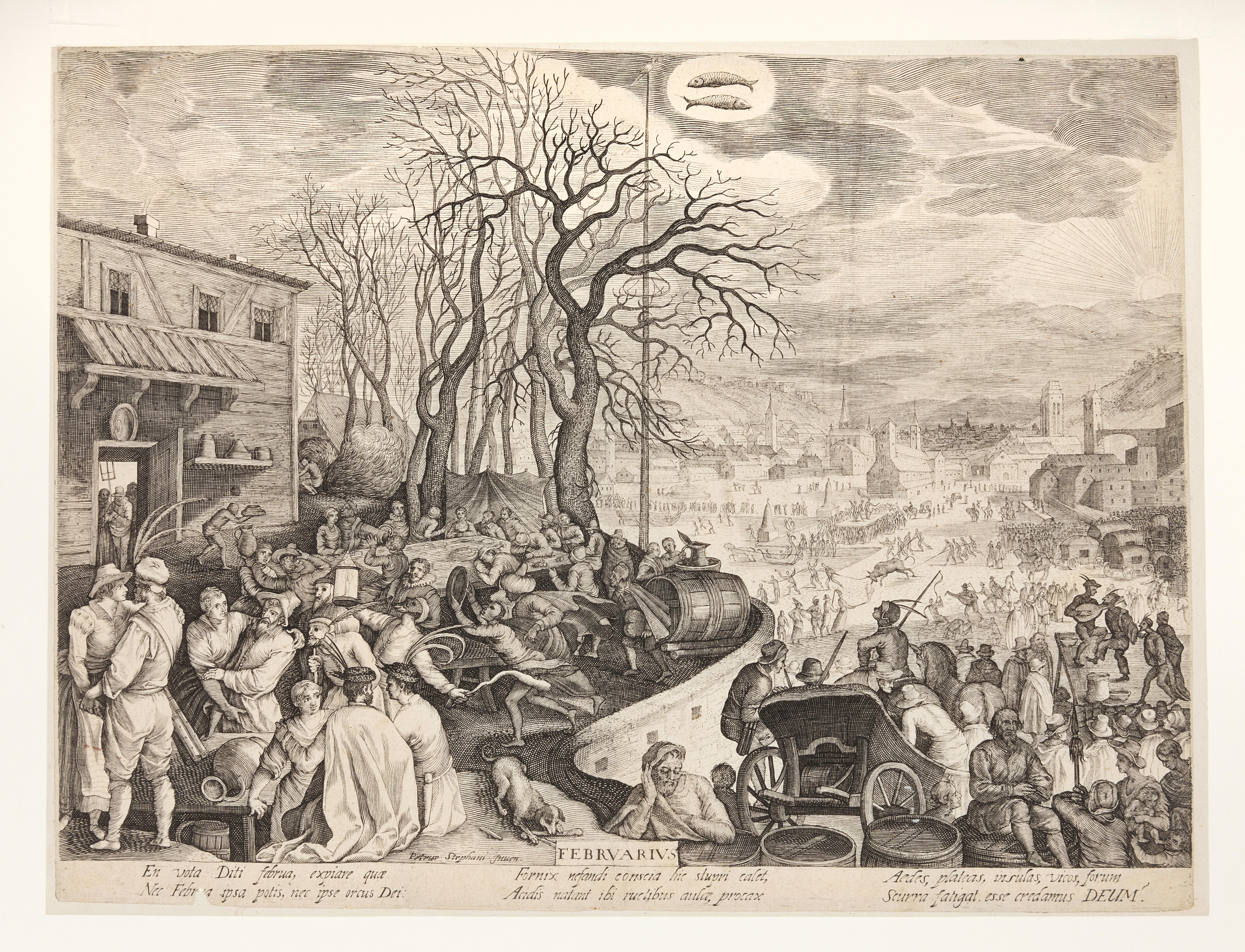 De afbeelding op de prent is een allegorie van de maand februari (Februarius). De afbeelding toont het carnaval bij een herberg en een stadsgezicht met ijsvermaak. Bovenaan, in het midden, is het sterrenbeeld Vissen afgebeeld. Onderaan staat drie maal een tweeregelig Latijns onderschrift. Dit is een gravure naar een werk van Pieter Stevens. De prent ...