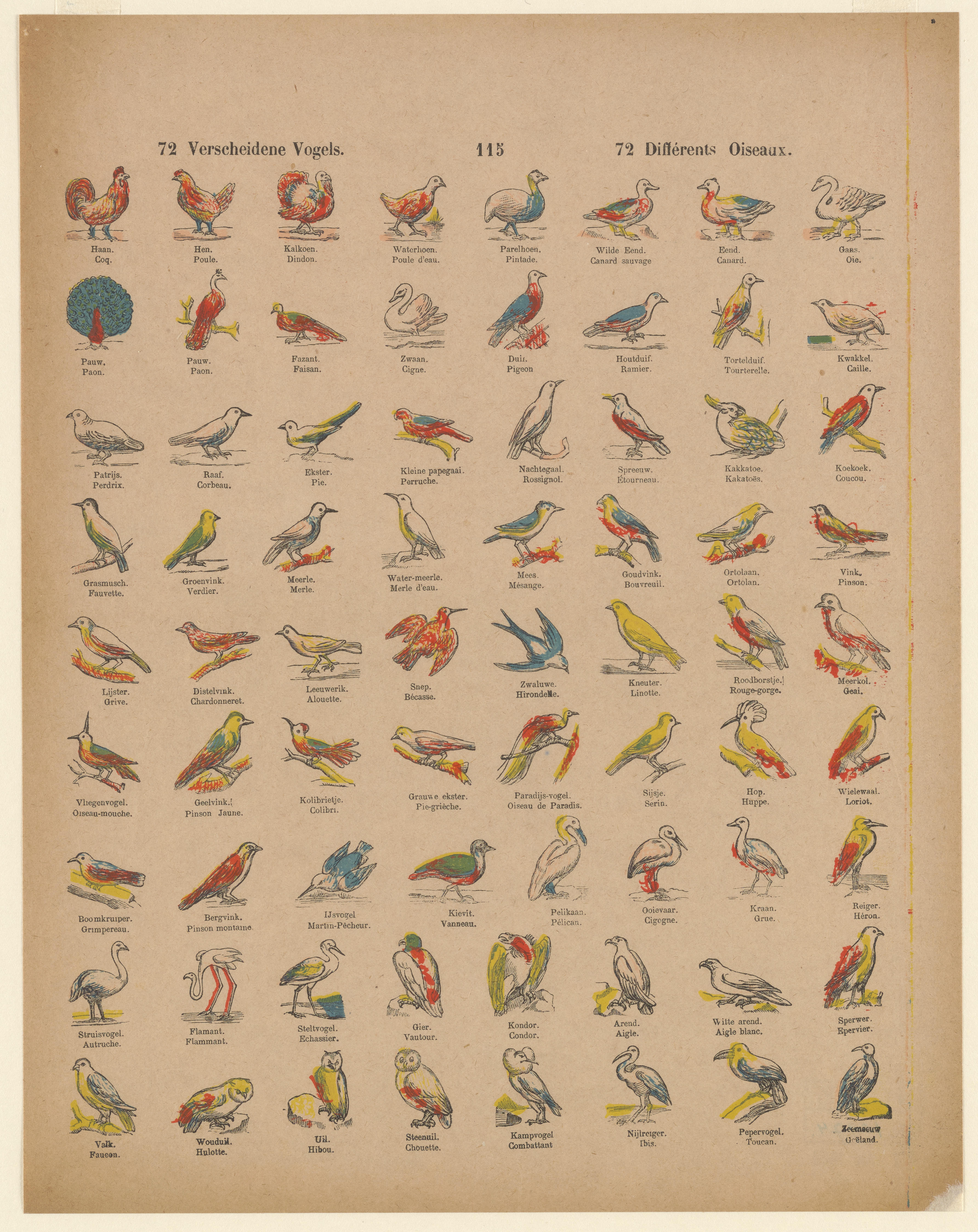 Prent met 72 afbeeldingen van vogels. Onder elke voorstelling staat de naam van de vogel in het Nederlands en het Frans. Dezelfde prent is door Brepols eerder uitgegeven in houtsnede.