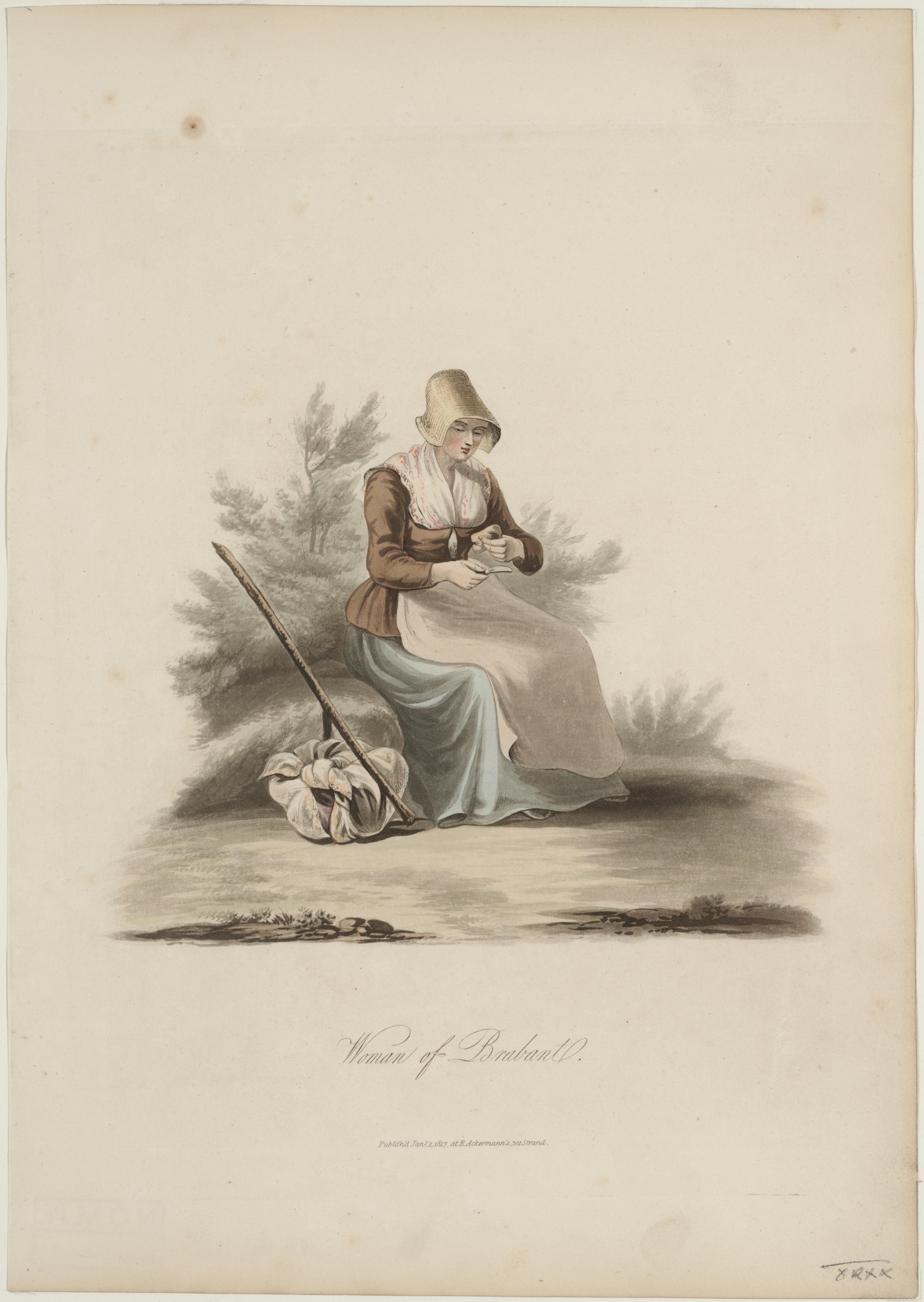 Handgekleurde gravure van een Brabantse vrouw op reis. De gravure is gepubliceerd als plaat 22 in ‘The costume of the Netherlands, displayed in thirty coloured engravings after drawings from nature’ van miss Semple. Dit werk is 1817 uitgegeven door R. Ackermann in Londen.
