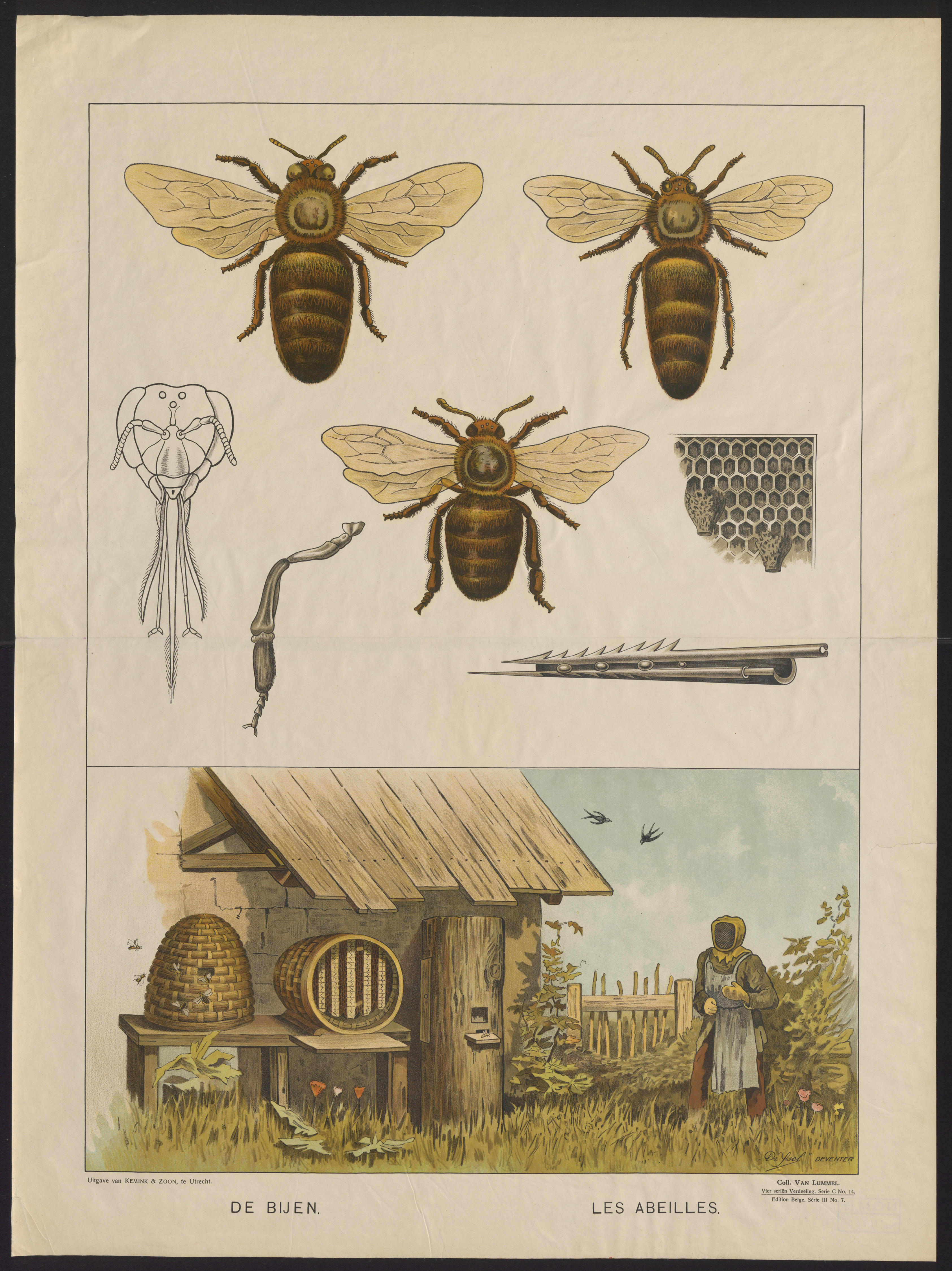 Onderwijsprent met verschillende afbeeldingen die te maken hebben met bijenhouden, gedrukt in lithografie. Tweetalige platen voor de Belgische markt werden na 1900 door de Utrechtse uitgever Kemink & Zoon op de markt gebracht.