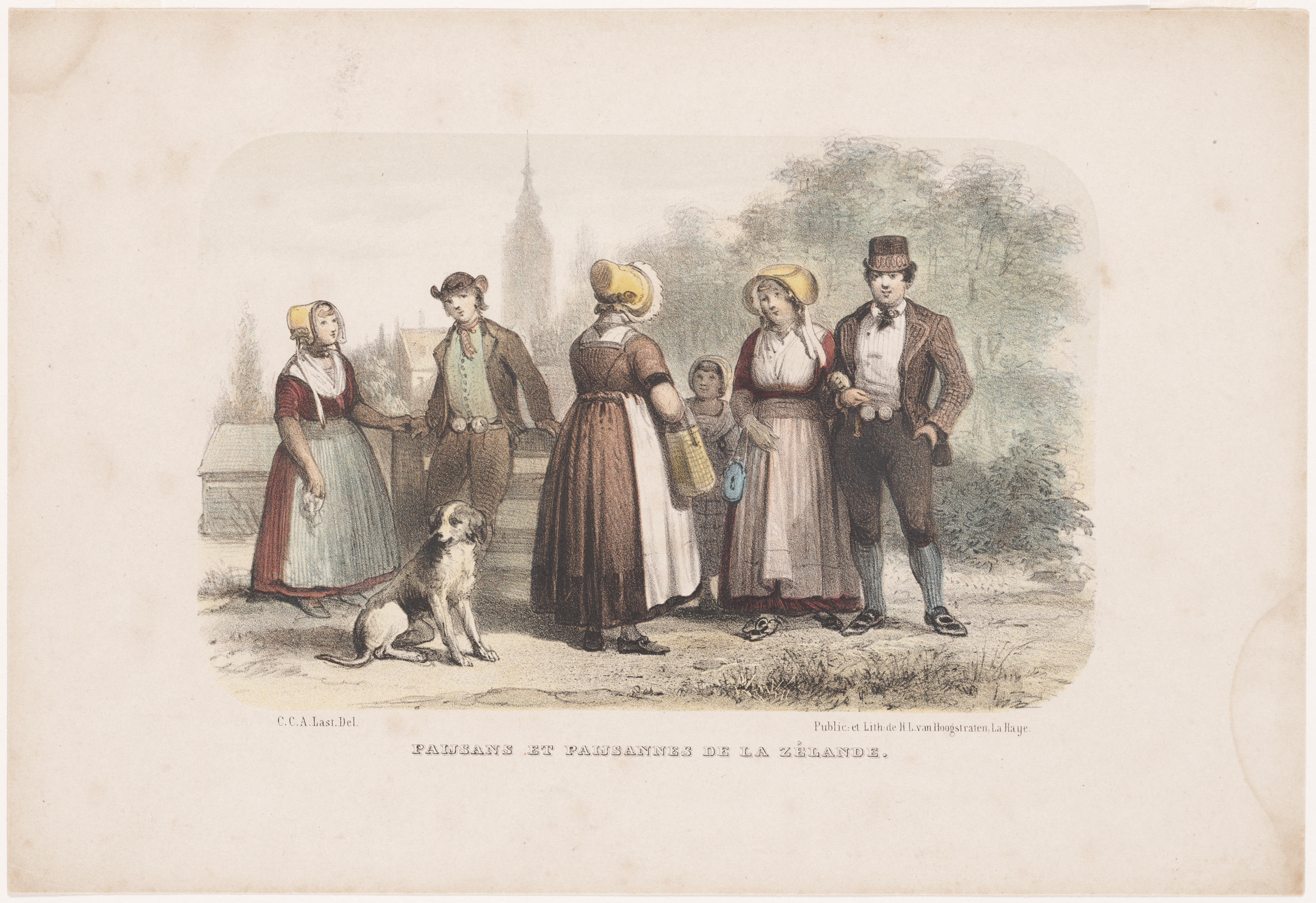 Prent van Zeeuwse boeren en boerinnen, een meisje en een hond.