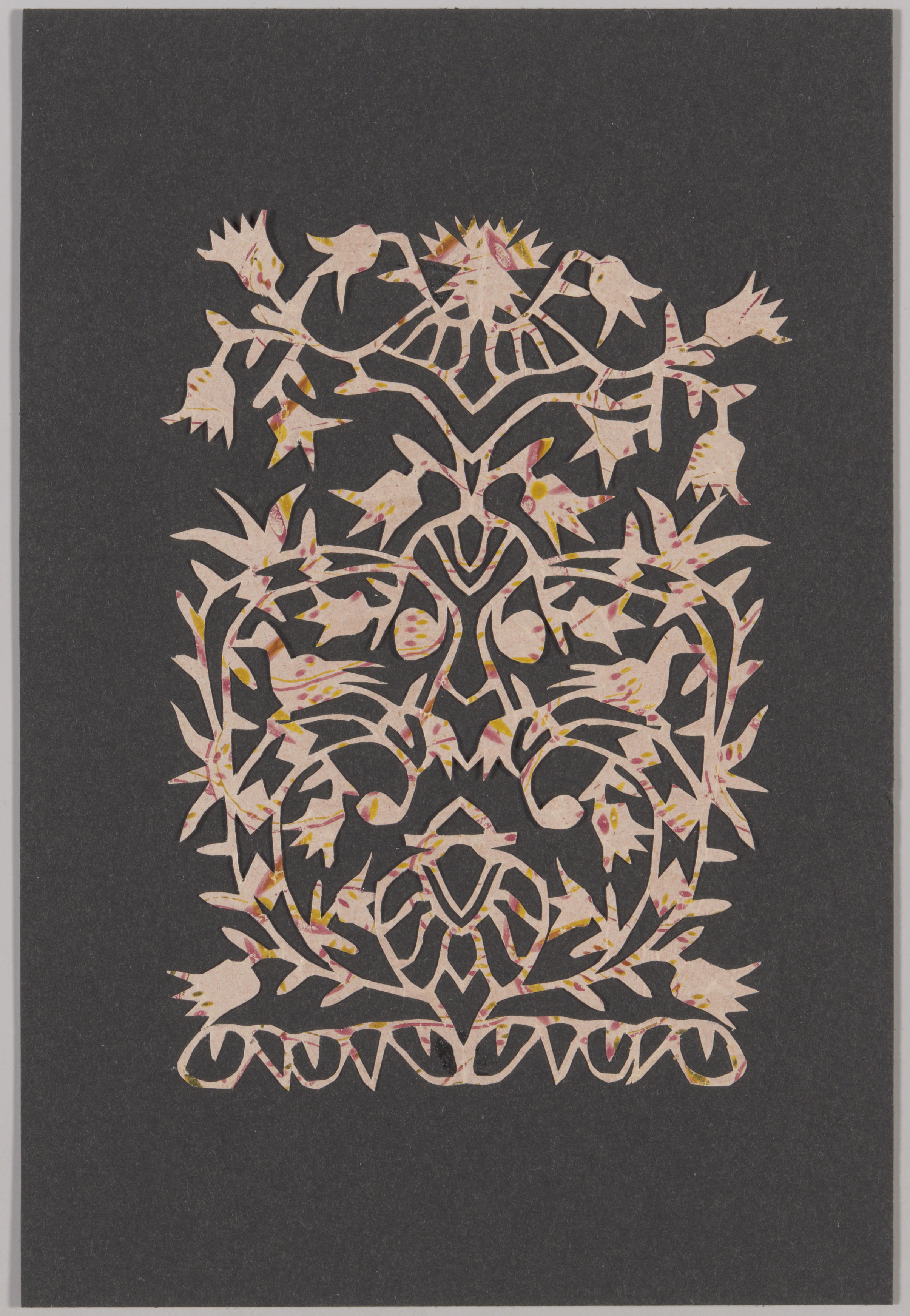 Tweezijdig symmetrisch knipsel uit bedrukt roze papier van bloemen en twee vogels.