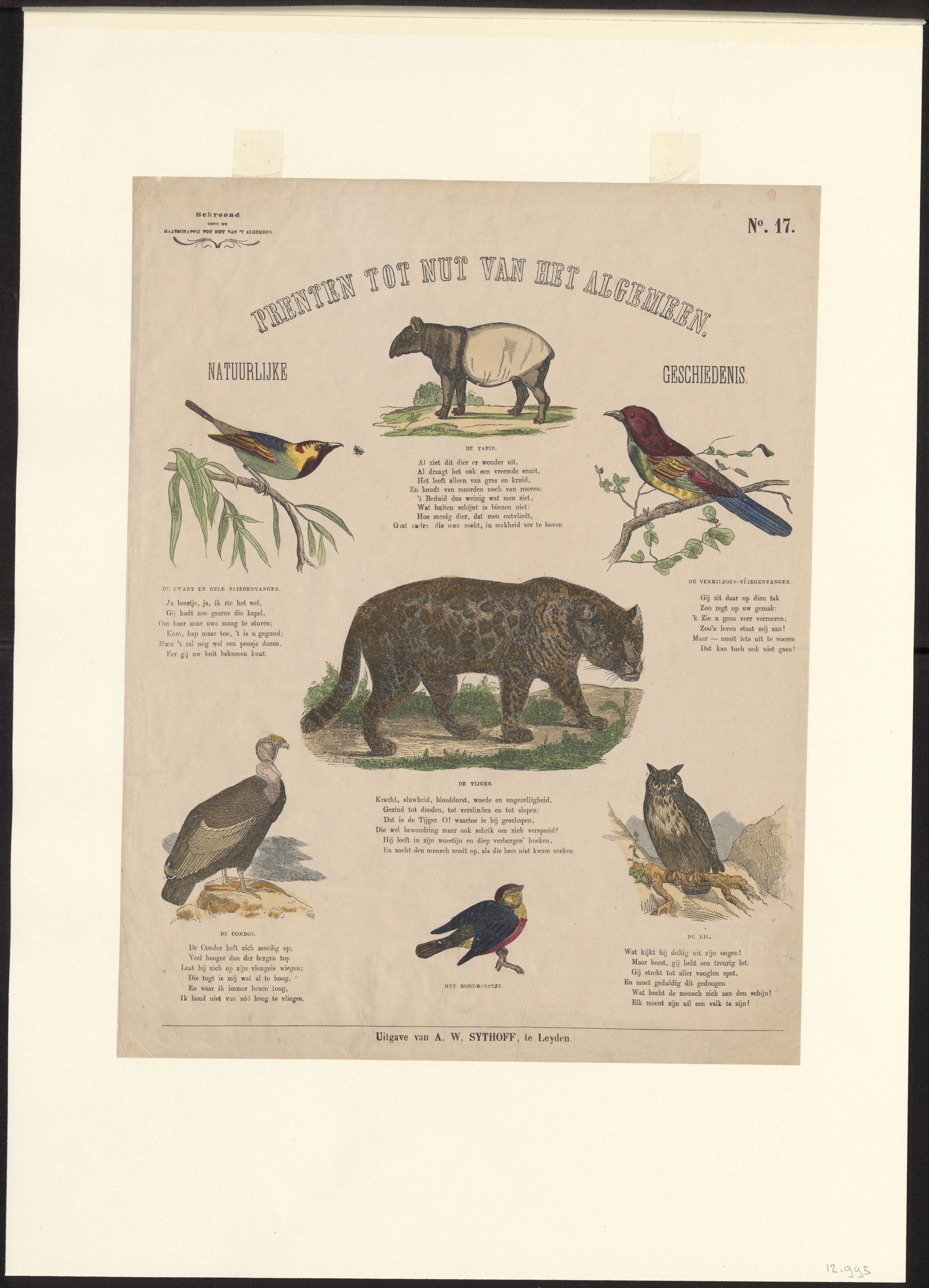 Prent met zeven afbeeldingen van verschillende dieren, gedrukt met afzonderlijke houtgravures en ingekleurd met diverse kleuren. Onder iedere afbeelding staat een onderschrift. Linksboven staat de vermelding dat de prent is goedgekeurd door de Maatschappij tot Nut van 't Algemeen.