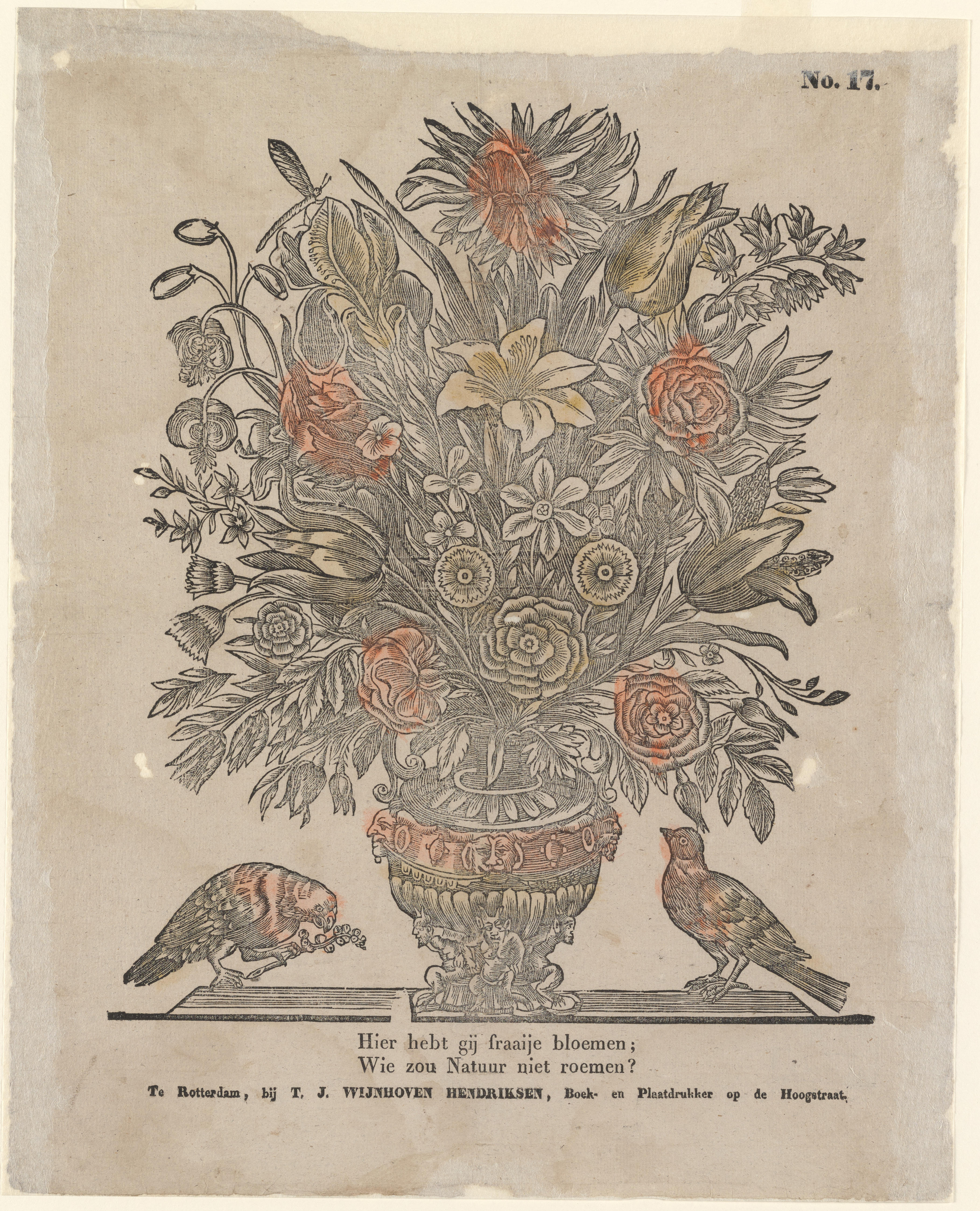 Prent met een afbeelding van een vaas met bloemen. Aan weerszijden van de vaas zit een vogel. De prent is gedrukt met een houtsnede en ingekleurd met geel en rood. Onder de vaas staat een tweeregelig onderschrift in boekdruk.