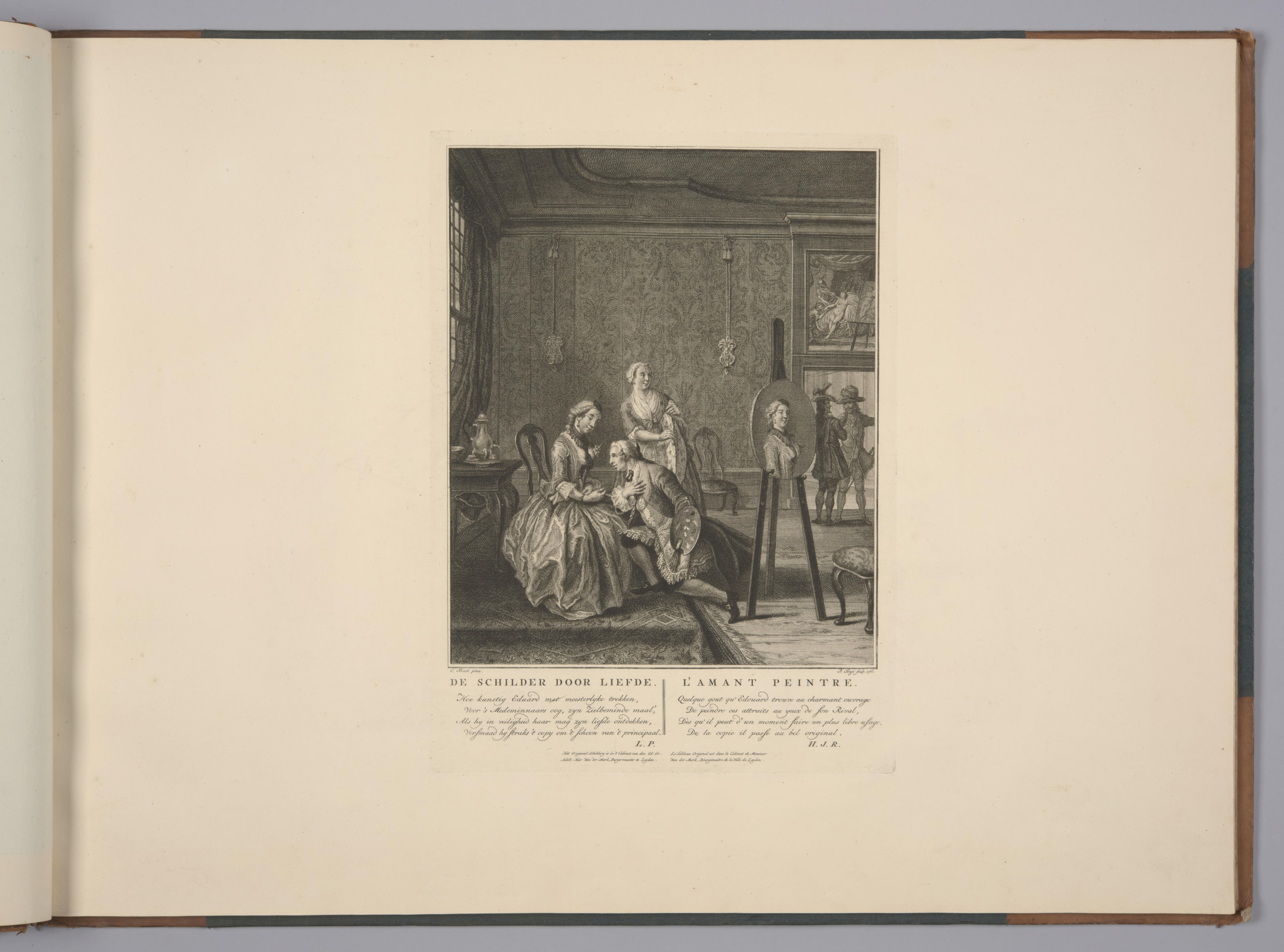 Gravure van een scène uit het tweede bedrijf van het toneelstuk 'De schilder door liefde' van Molière. De schilder Eduard verklaart Leonoor, wiens portret hij vervaardigd heeft, zijn liefde. Bij de deur staat Leonoor's jaloerse man Don Pedro, die door de schildersknecht bezig wordt gehouden. Boven de deur hangt een schilderij met een voorstelling van ...