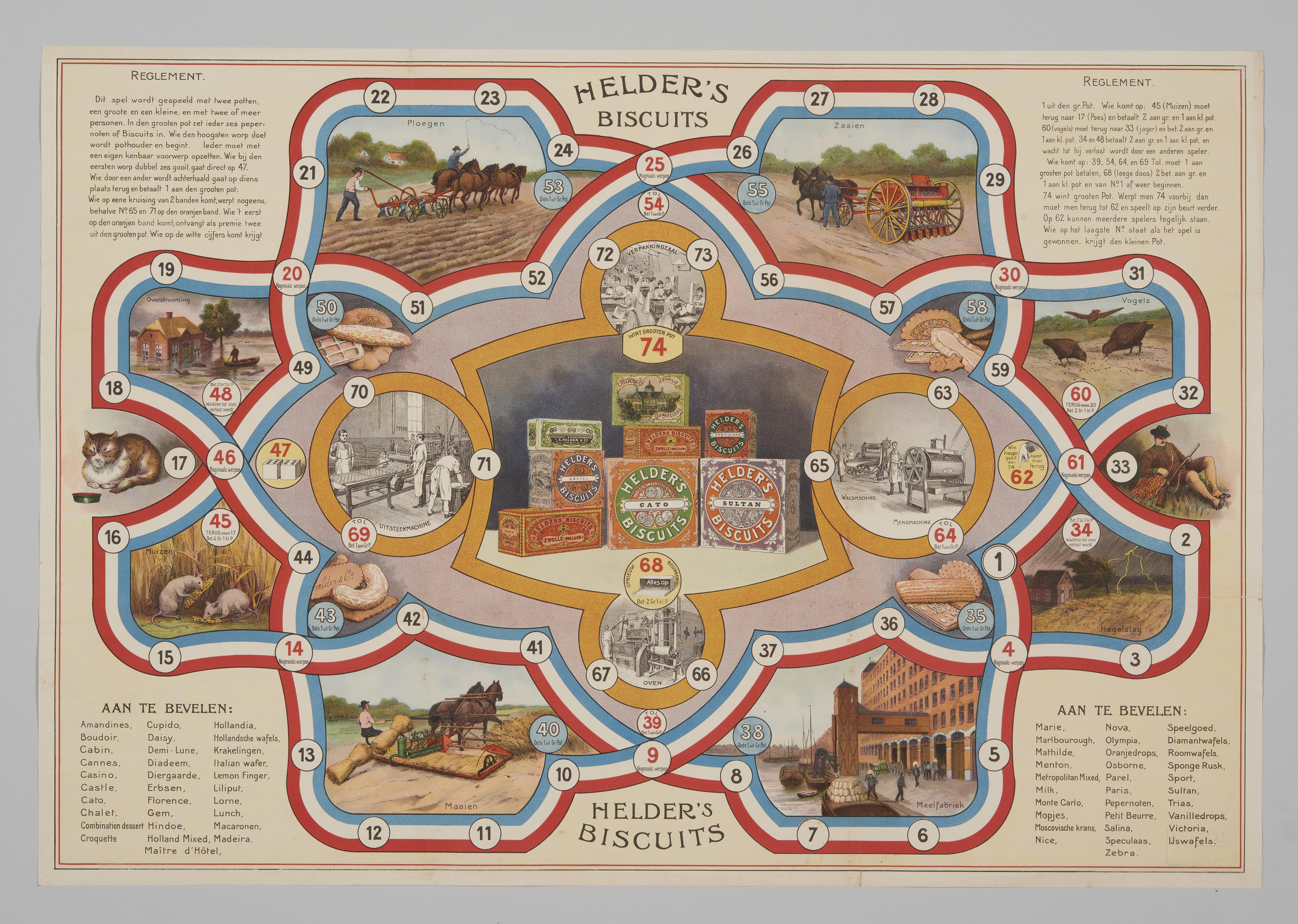 Bordspel met 74 speelvakken, uitgegeven door de N.V. Zwolsche Biscuitsfabriek, voorheen Helder & Co.