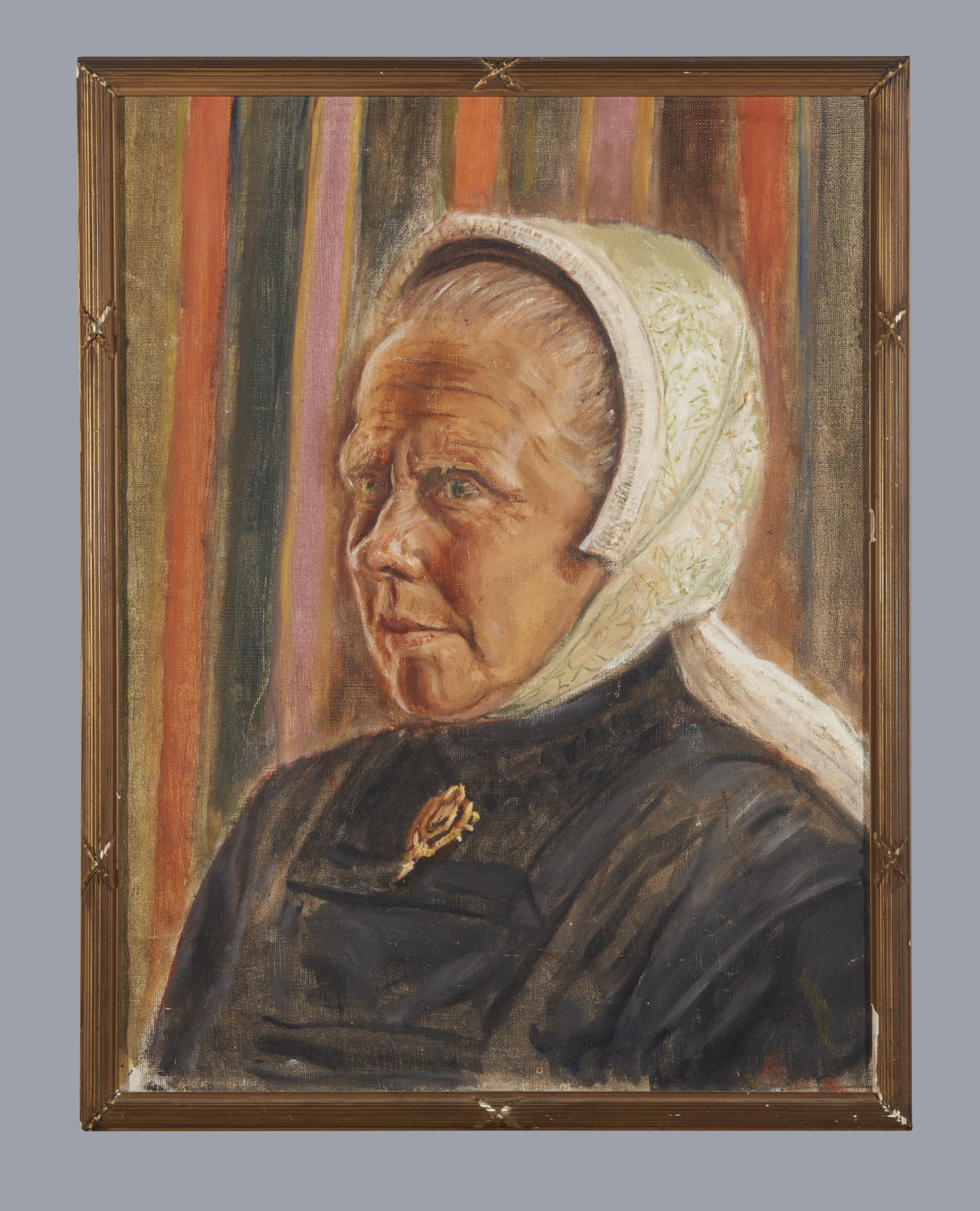 Portret in olieverf van een vrouw in haar zondagse kleding uit de Achterhoek of Twente. Zij draagt de knipmuts. Daaroverheen zit het zogenaamde lintentuigje, een versiering van glanzend satijnlint met ingeweven motieven.