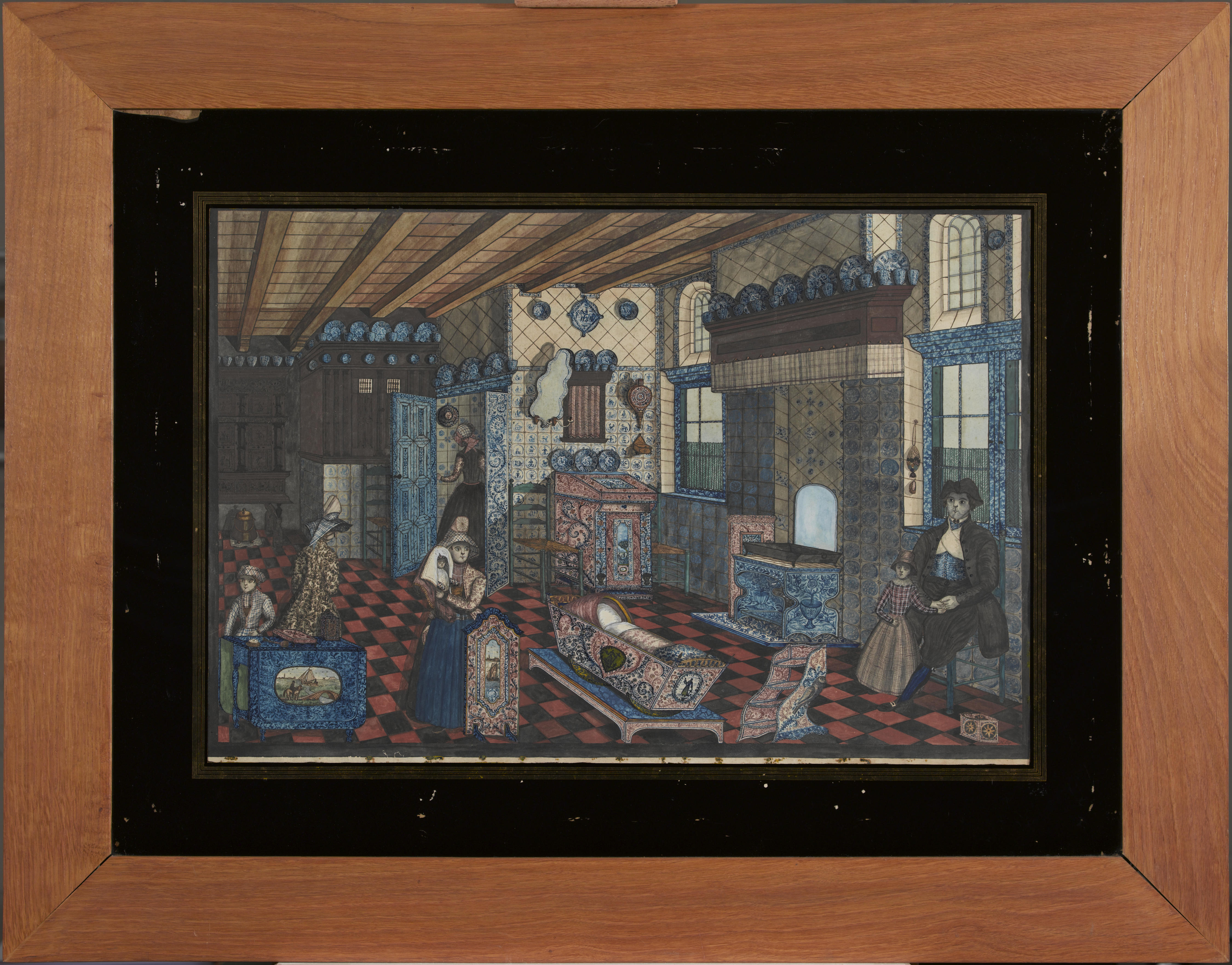 Aquarel van mensen in Hindelooper dracht in een Hindelooper stijlkamer met een exposé van alle voor Hindeloopen destijds typisch geachte meubels, zoals een Hollandse hangoortafel, een haarscherm, een lessenaar, een schommelwieg op een bankje, een vuurbank en een bedstedetrapje.