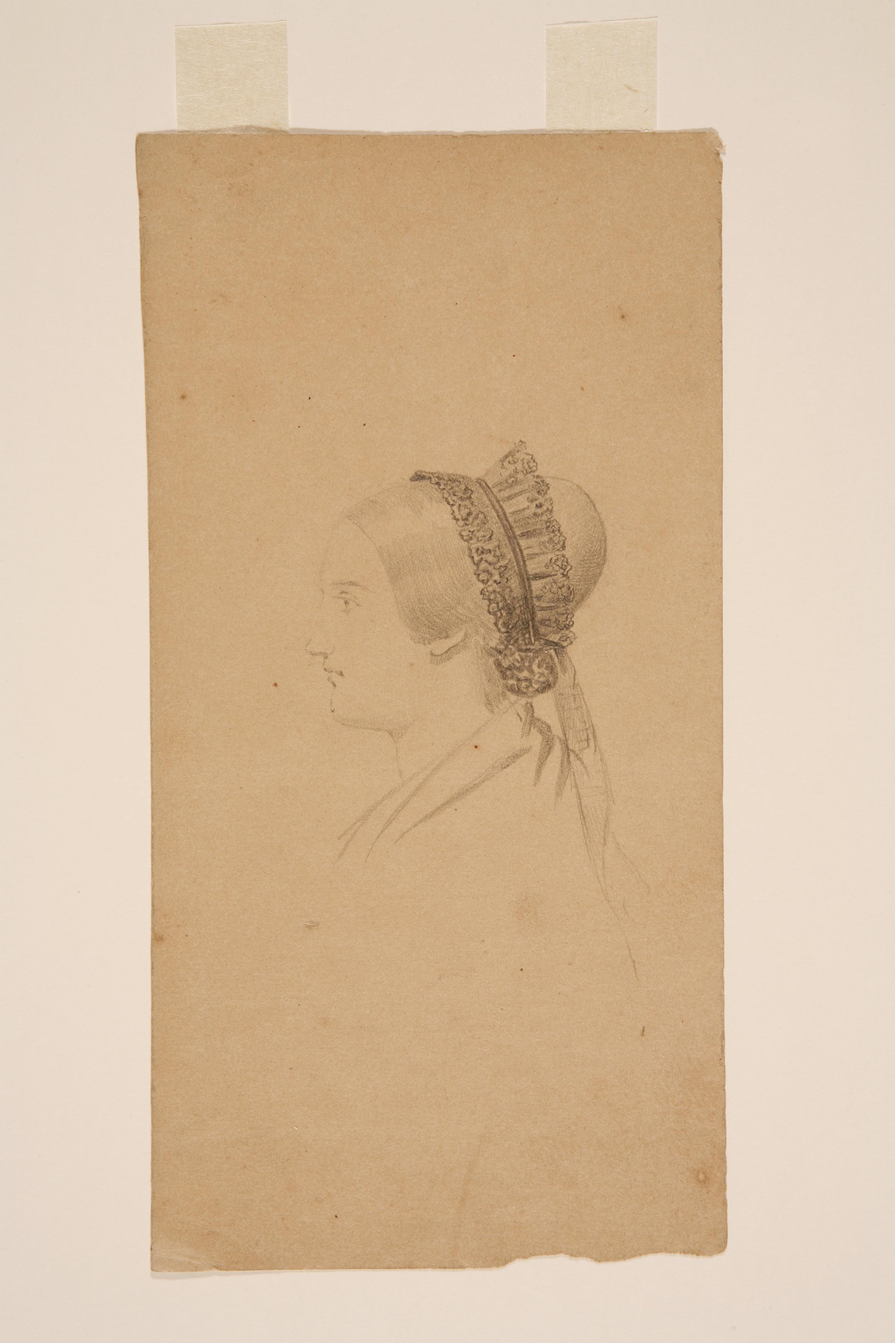 Potloodtekening van een vrouw in modekleding, en profil, met een modieus kapsel en kanten siersel om de haarknot.