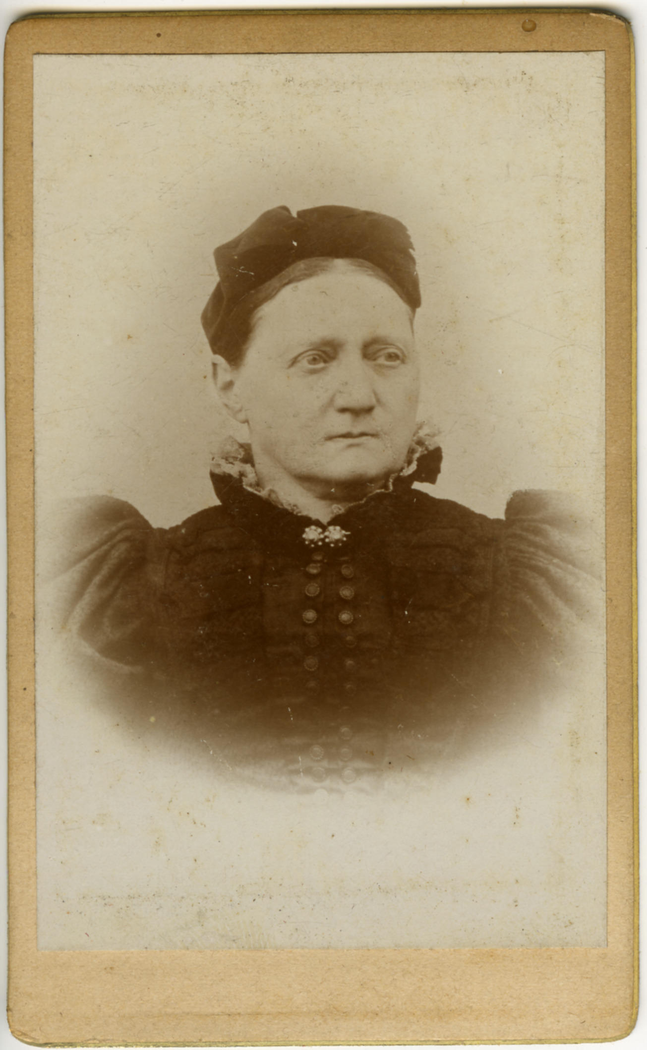 Vrouw, gekleed in modedracht. Ze draagt een broche die gemaakt is van twee 'Zeeuwse knopen'.