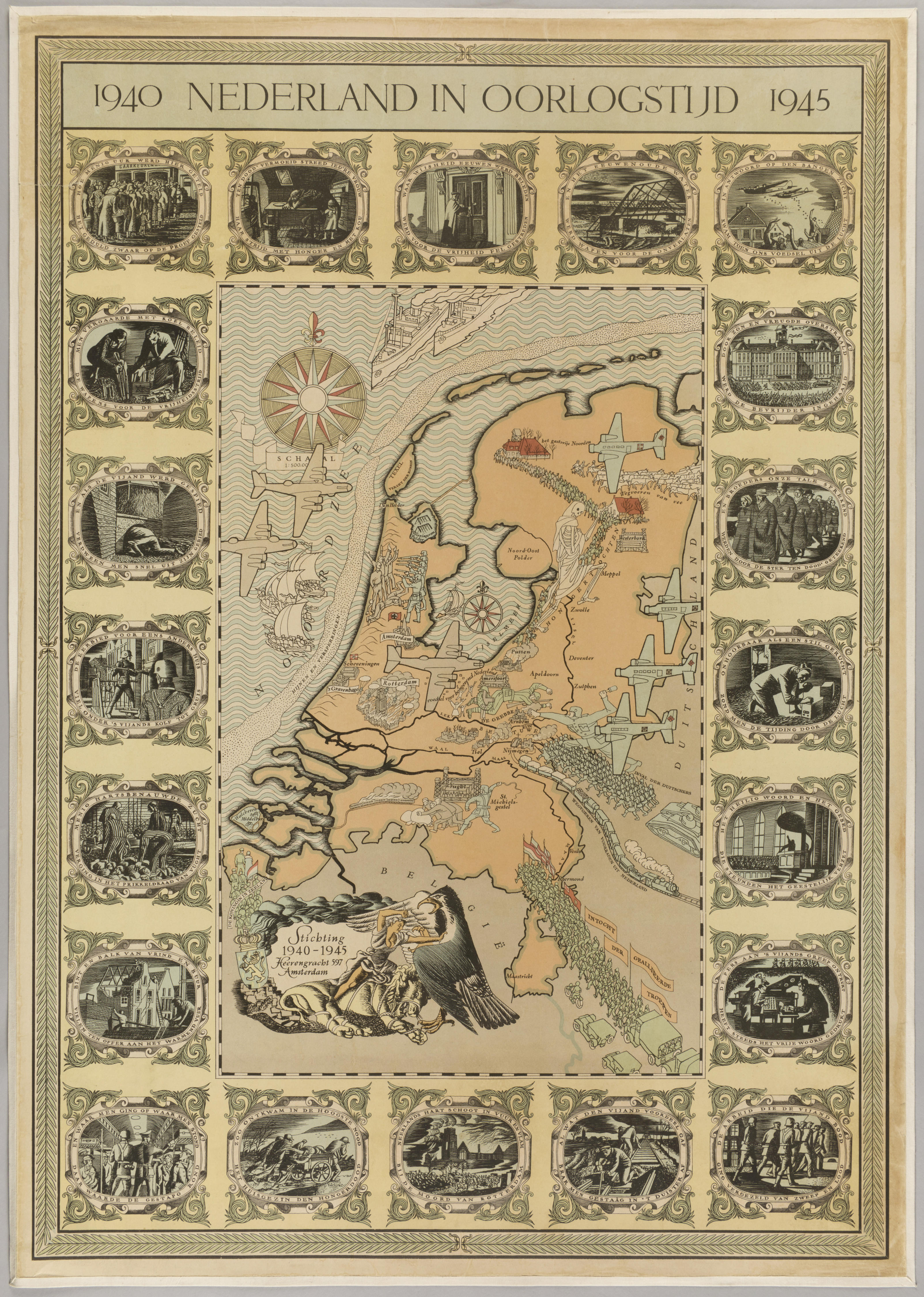 Affiche met een kaart van Nederland met rondom afbeeldingen met spreuken die verwijzen naar onderdrukking en verzet. Het titel luidt: ‘1940 NEDERLAND IN OORLOGSTIJD 1945’. Het affiche zijn in 1946 gemaakt door graficus Frans Meijer. Het was bestemd voor de werving van contributanten en werd opgehangen in scholen en bedrijven. Het affiche werd ook wel ...