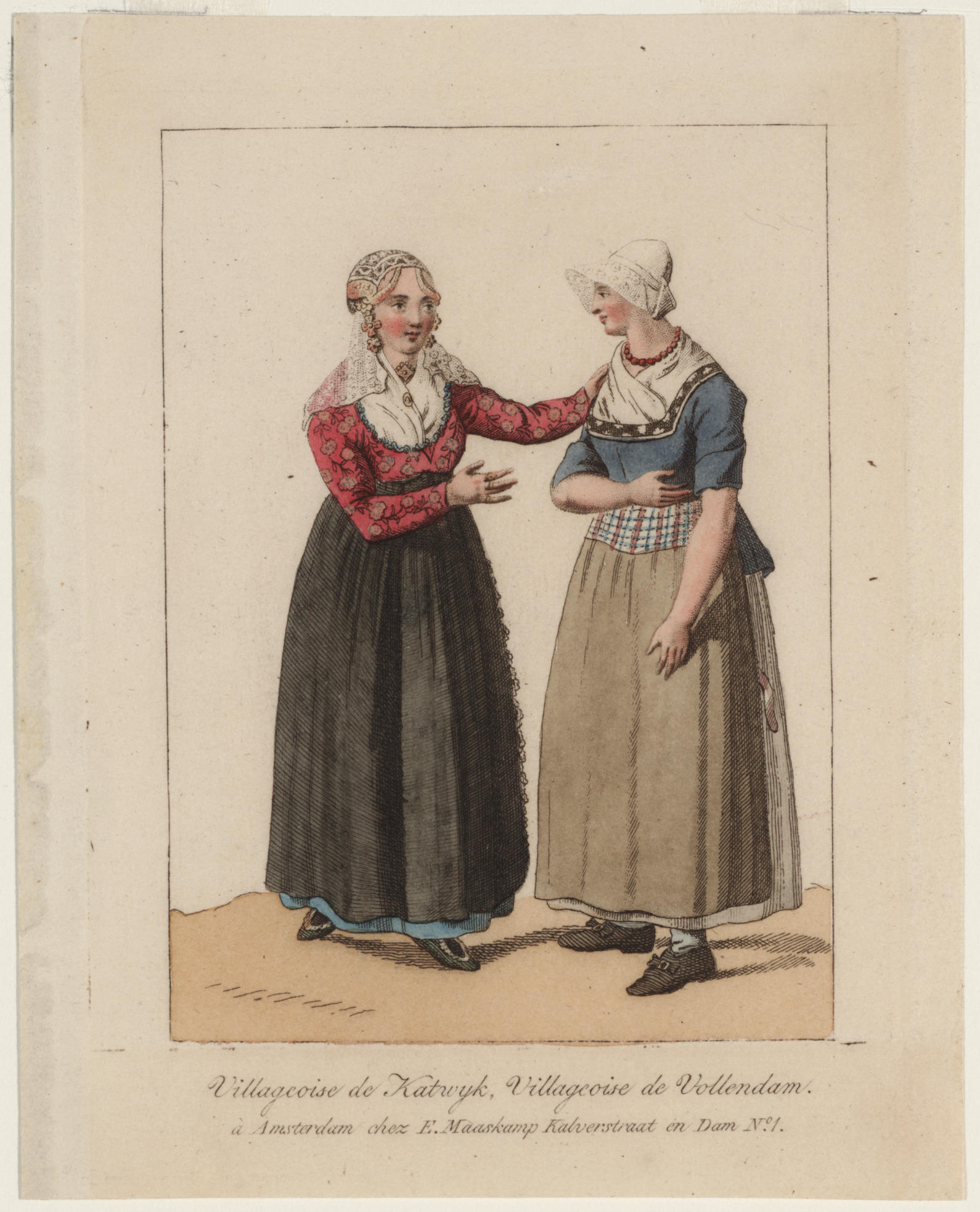 Prent van twee vrouwen. De linker vrouw komt uit Katwijk; de rechter vrouw is afkomstig uit Volendam.