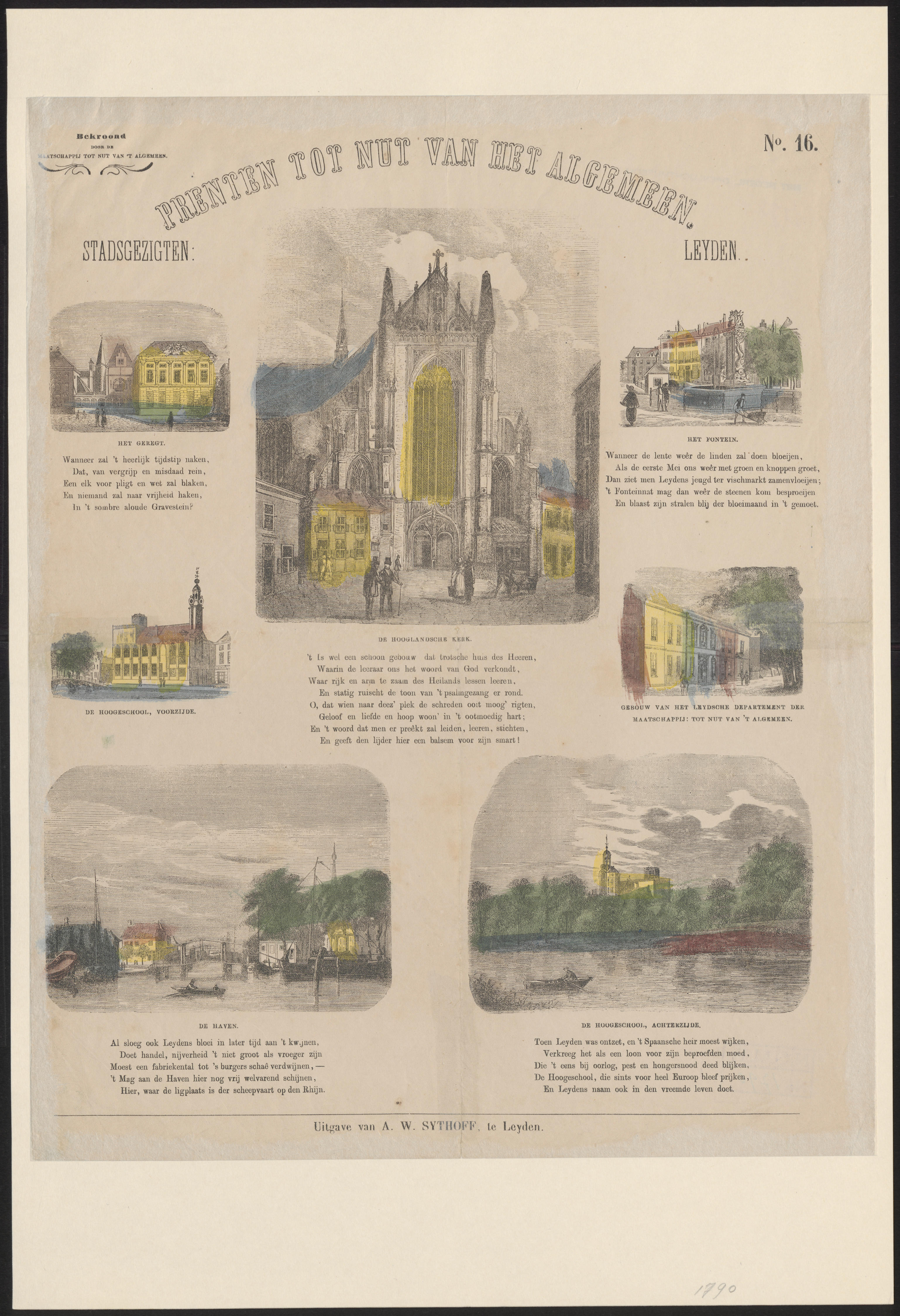 Prent met zeven Leidse stadsgezichten, gedrukt met afzonderlijke houtgravures en ingekleurd met rood, geel, blauw en groen. Onder iedere afbeelding staat een onderschrift. Linksboven staat de vermelding dat de prent is goedgekeurd door de Maatschappij tot Nut van 't Algemeen.