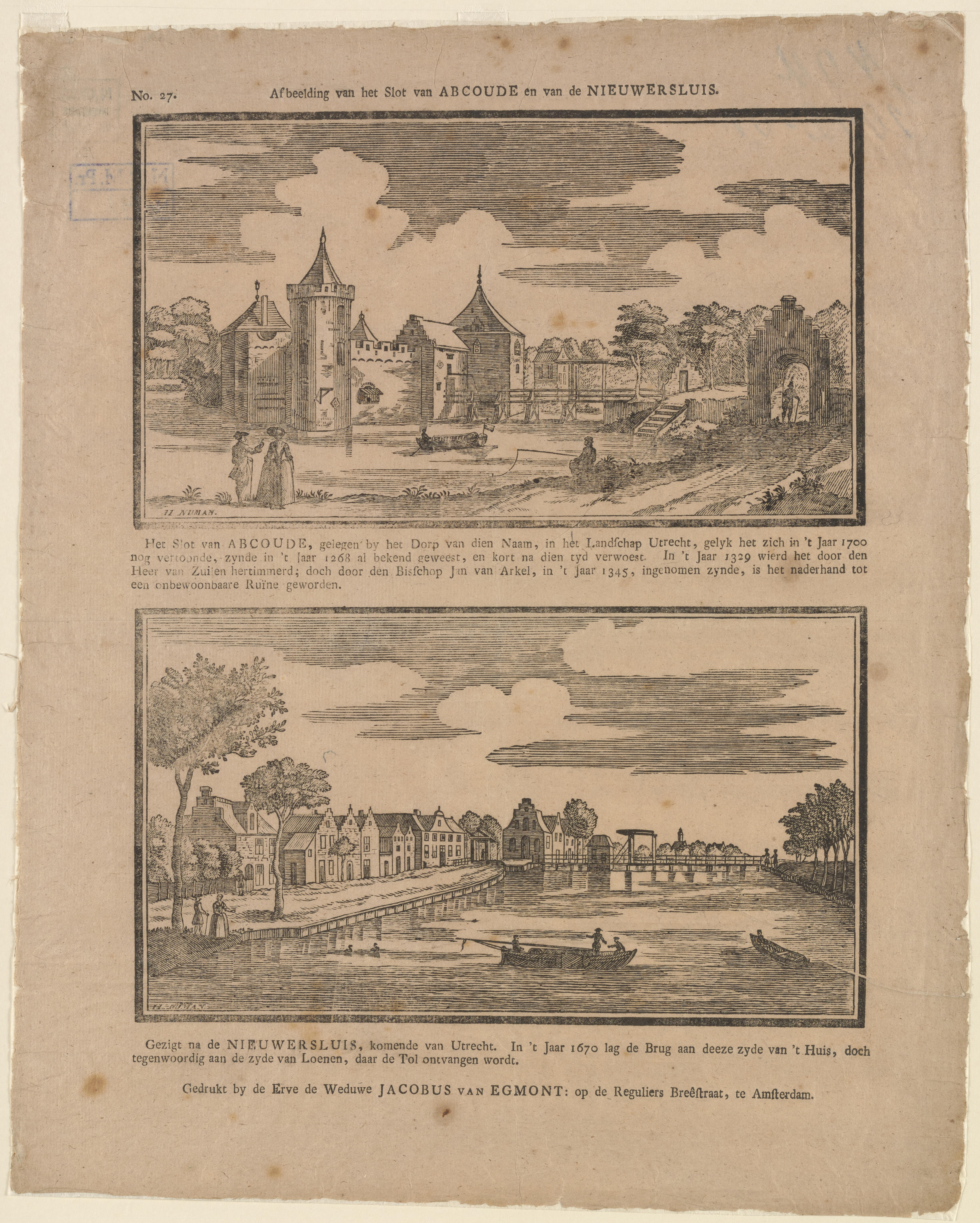 Prent met een afbeelding van Slot Abcoude en een afbeelding van het dorp Nieuwesluis. De afbeeldingen zijn gedrukt met afzonderlijke houtsneden. In beide afbeeldingen is linksonder de signatuur van graveur Hendrik Numan te zien.