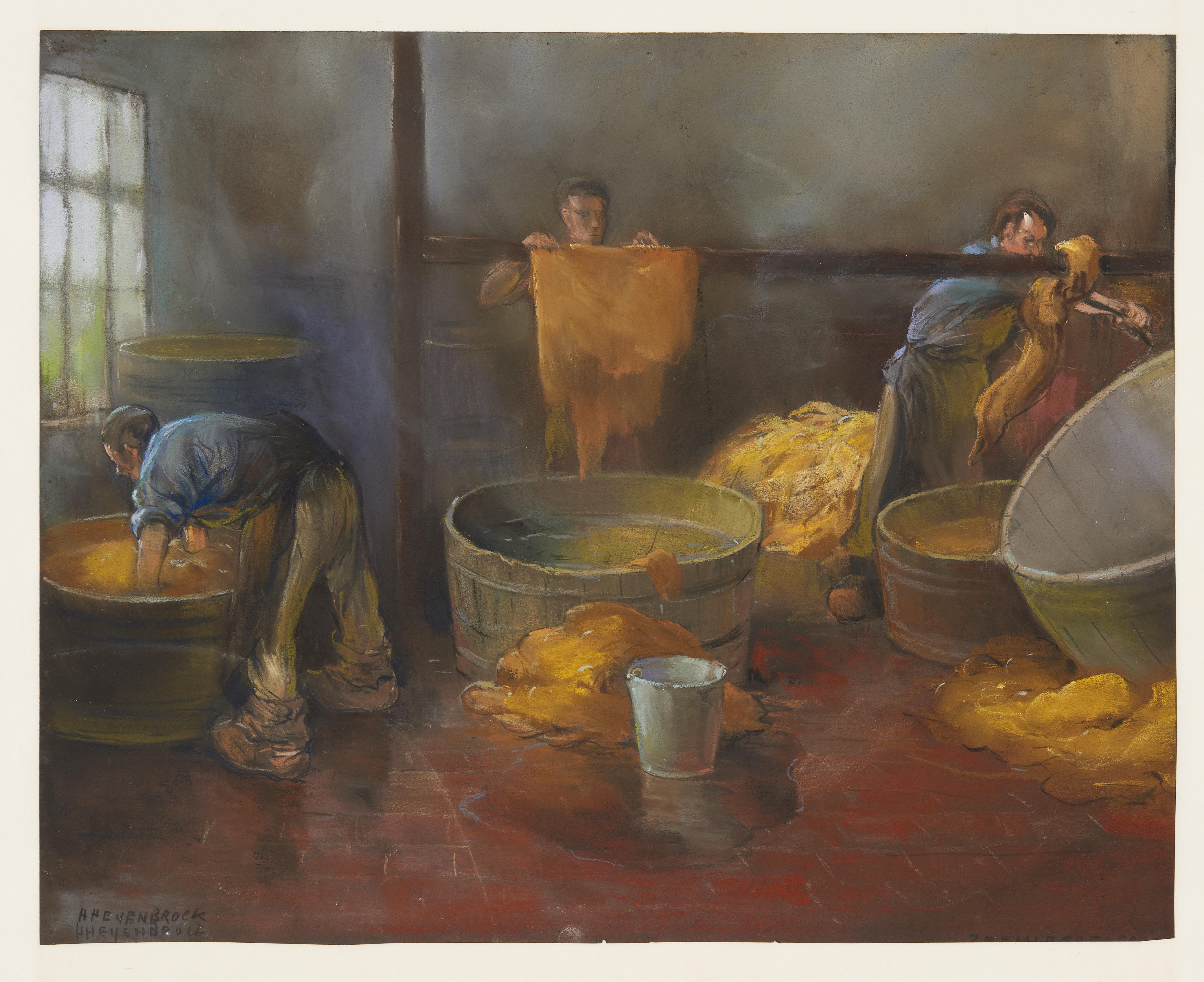 Pastel van het interieur van een zeemleerfabriek. Van schapen- en geitenvellen worden zeemleren gemaakt door ze met traan te bewerken. Traan is olie die verkregen is uit het spek van (wal)vissen.