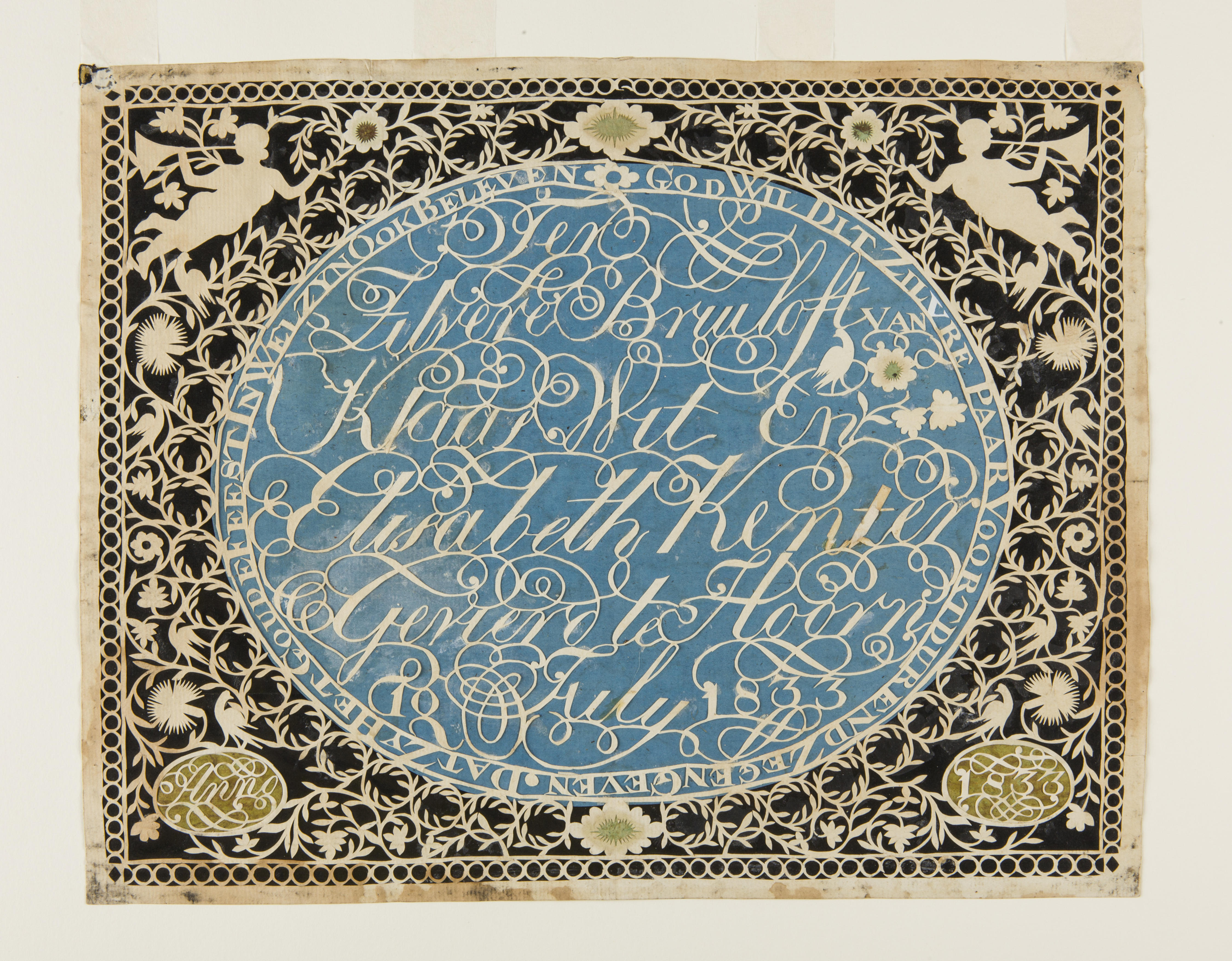 Knipprent met de tekst: 'Ter gelegenheid van de zilveren bruiloft van Klaas Wit en Elisabeth Kenter, Hoorn 18 july 1833'. De prent is gemaakt door Arie Tergant (1774-1852), een populaire schaarkunstenaar uit Alkmaar. Het ovaal met tekst is omlijst met famen, bloemen en vogels op een zwarte achtergrond.