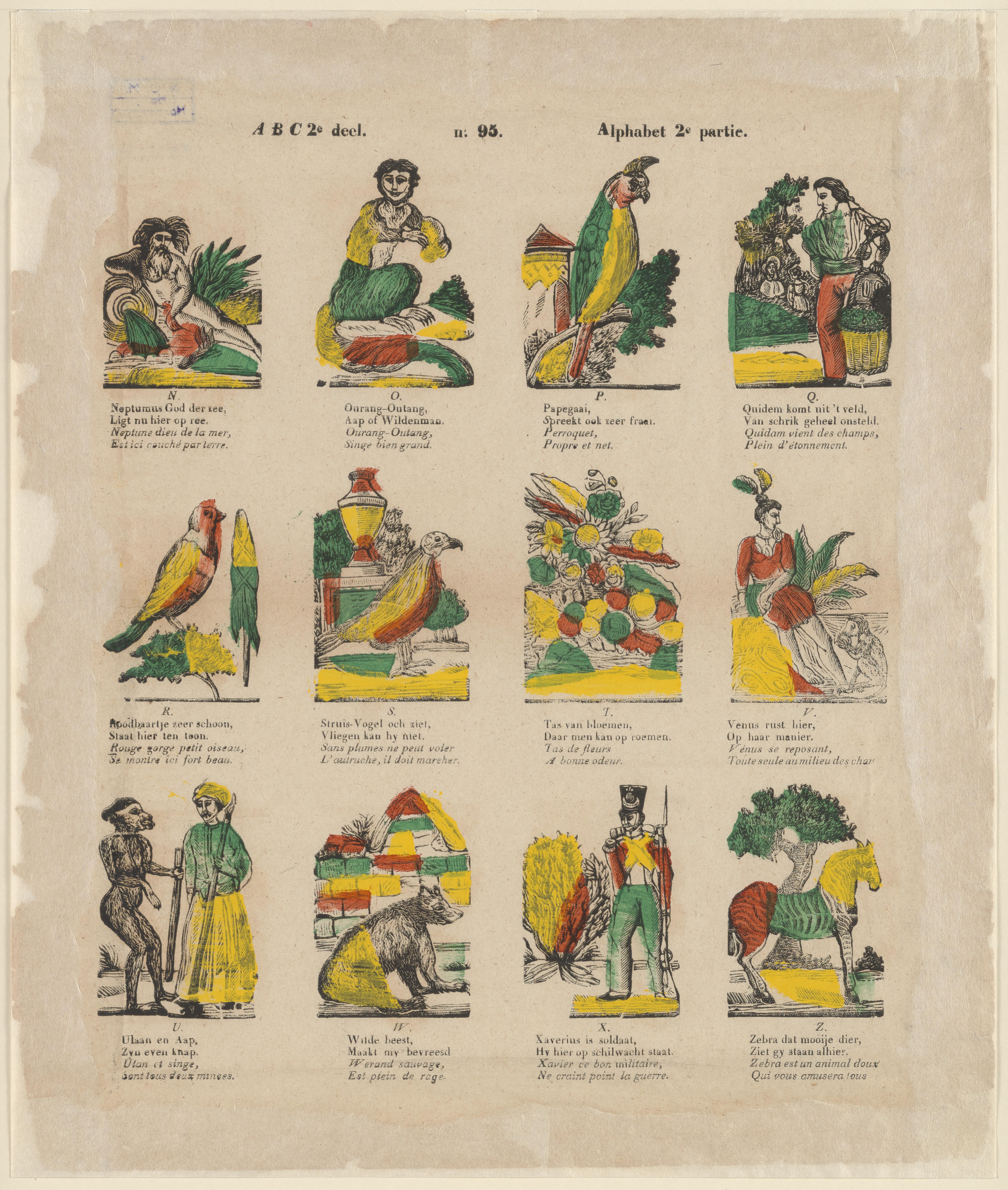 Alfabetprent van de letters N tot en met Z, zonder de Y. Bij elke letter staat een afbeelding en een tweeregelig vers in het Nederlands en het Frans. Op de prent is geen uitgever vermeld. De prent is gedrukt door de Turnhoutse uitgever Glenisson & van Genechten of zijn opvolger Glenisson & Zonen.