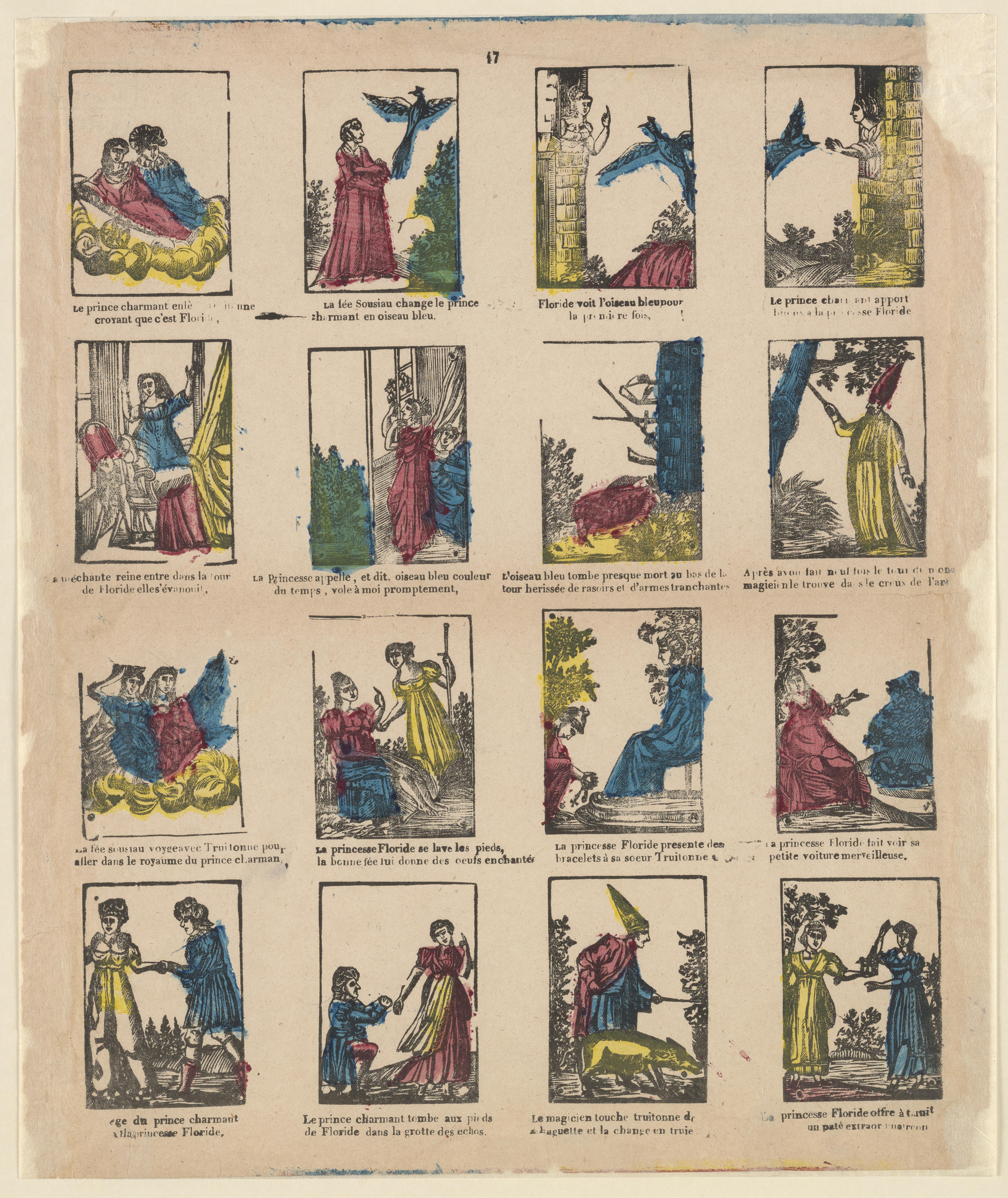 Prent met zestien afbeeldingen van het verhaal van prinses Floride en de blauwe vogel, gedrukt met afzonderlijke houtsneden en ingekleurd met rood, blauw en geel. Onder iedere afbeelding staat een onderschrift in het Frans, gedrukt in boekdruk. De prent heeft geen titel. Op de prent staat geen uitgever vermeld. Hij is toegeschreven aan Hemeleers van ...