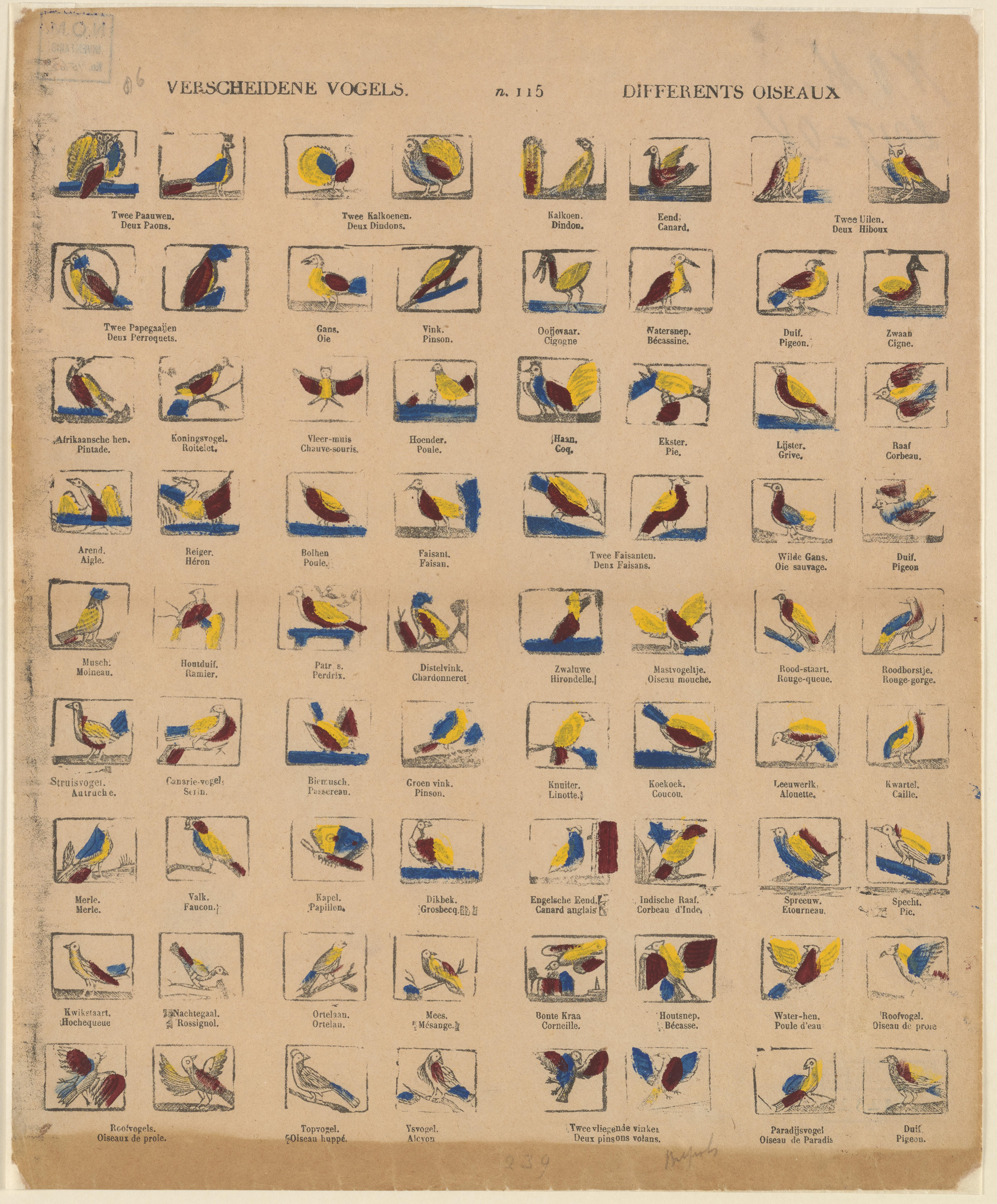 Prent met 72 afbeeldingen van verschillende vogels. Onder elke afbeelding staat een onderschrift in het Nederlands en het Frans. De tekst is gedrukt in boekdruk.