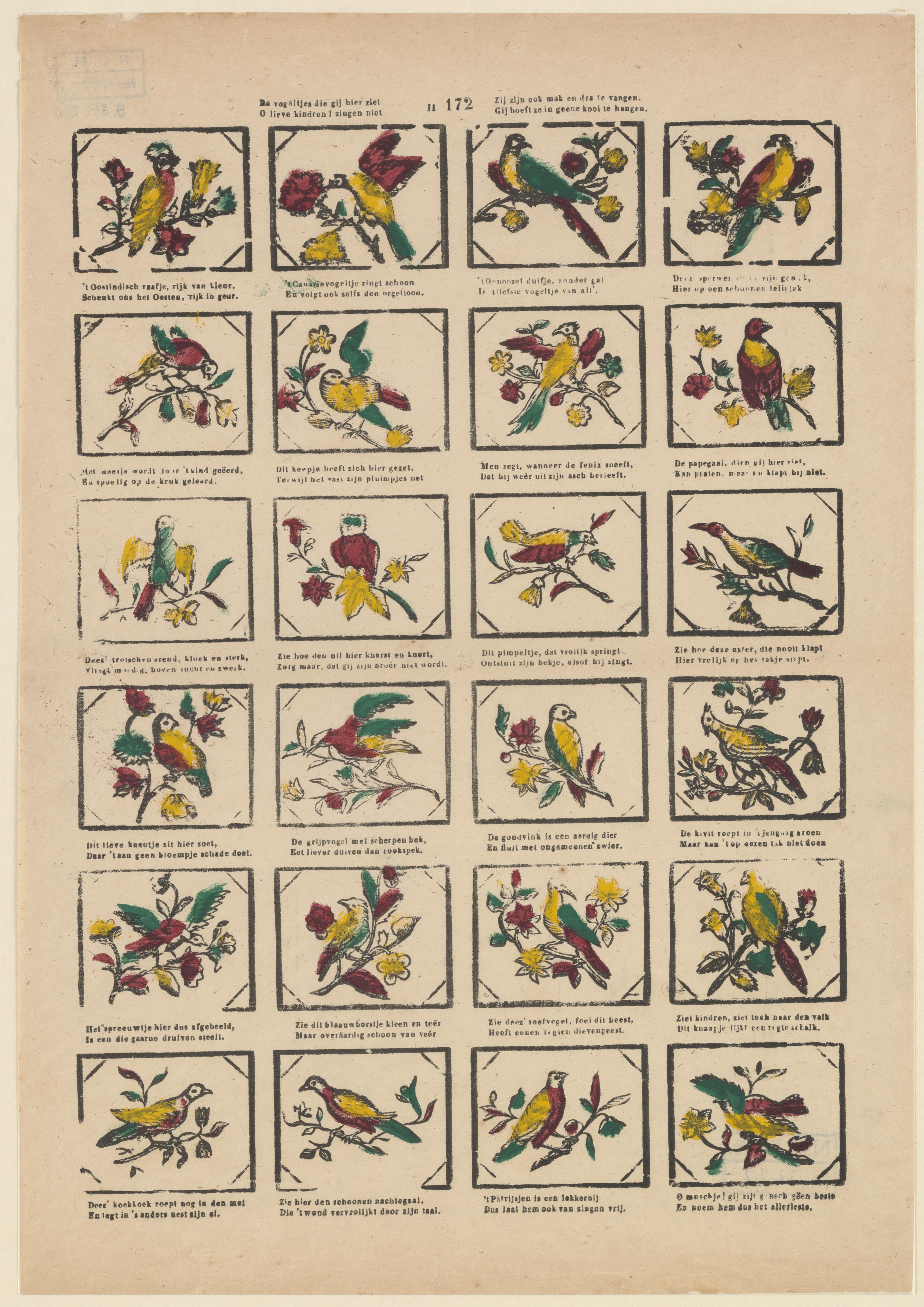 De vogeltjes die gij hier ziet / O lievekindren! zingen niet, // Zij zijn ook mak en dra te vangen, / Gij hoeft ze in geene kooi te hangen. - N.172