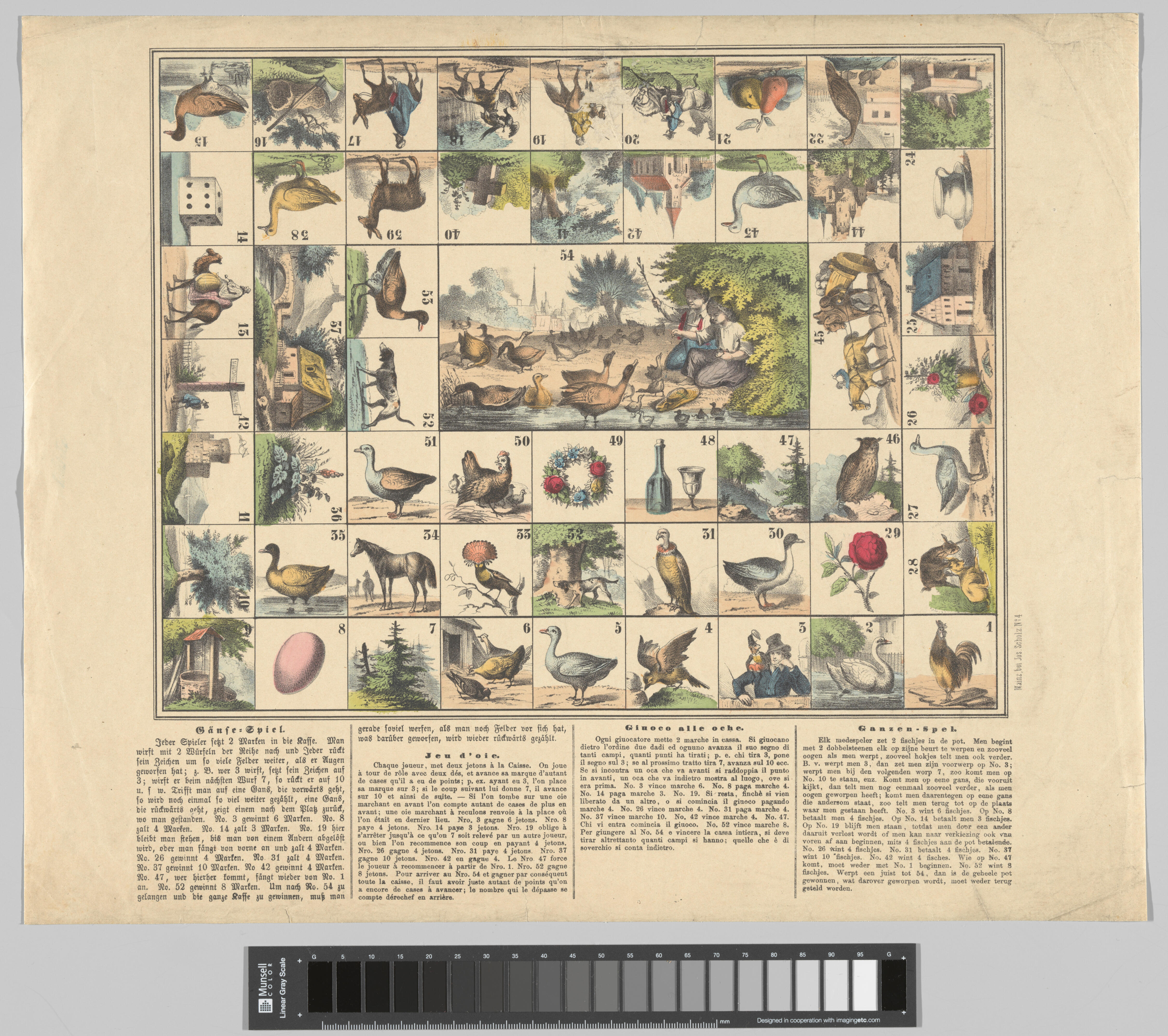 Ganzenbordspel met 54 speelvakken en onderaan de spelregels.
