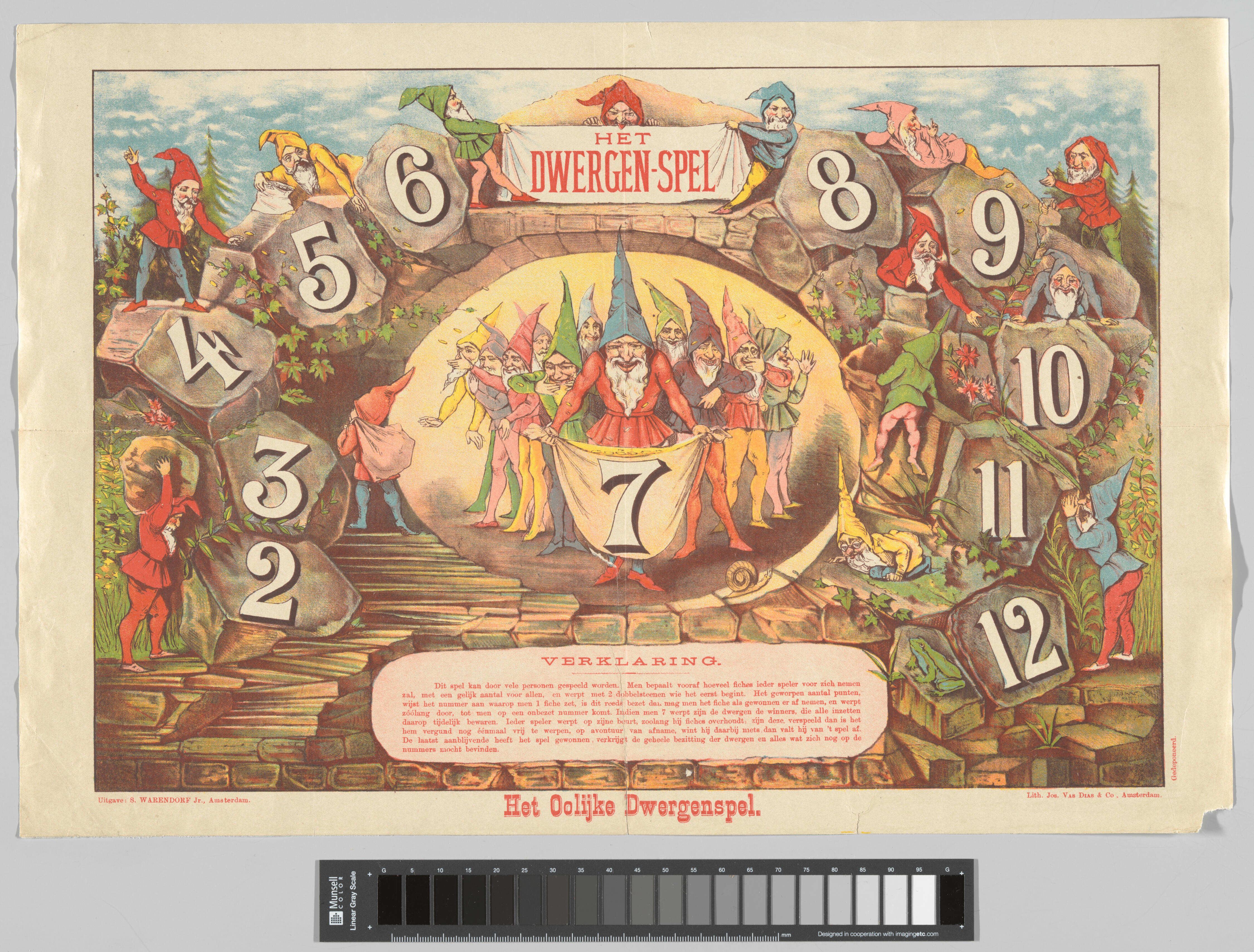 Bordspel met in het midden een voorstelling van een groep dwergen. De middelste dwerg houdt een zak vast met daarop het cijfer 7. Rondom de voorstelling staan de cijfer 2-12 op rotsen afgebeeld met daarop nog meer dwergen.