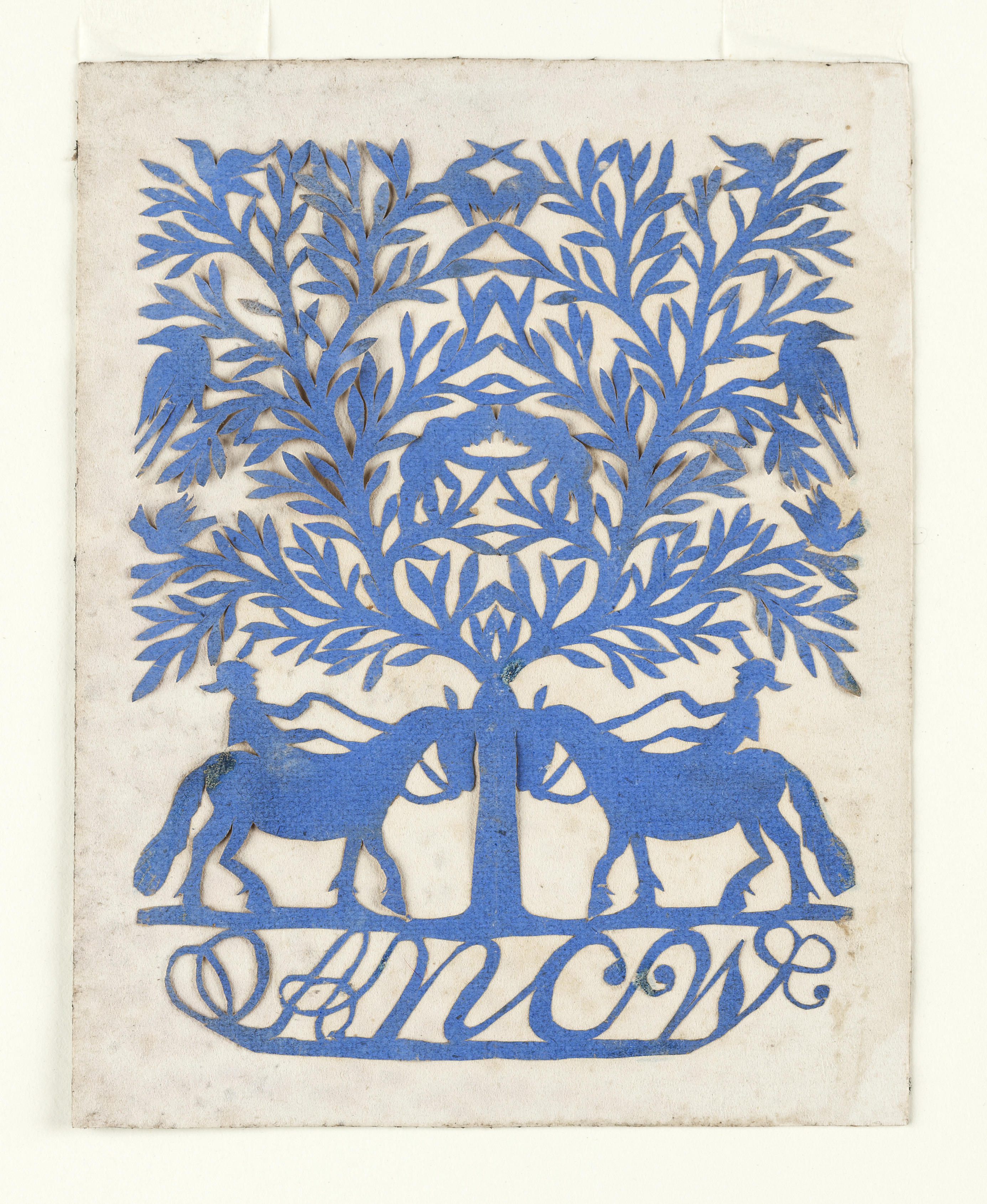 Het symmetrische, blauwe knipsel stelt een boom met ruiters voor. In de boom zitten mannetjes en vogels. Onderaan staan de letters ‘ANCW’.