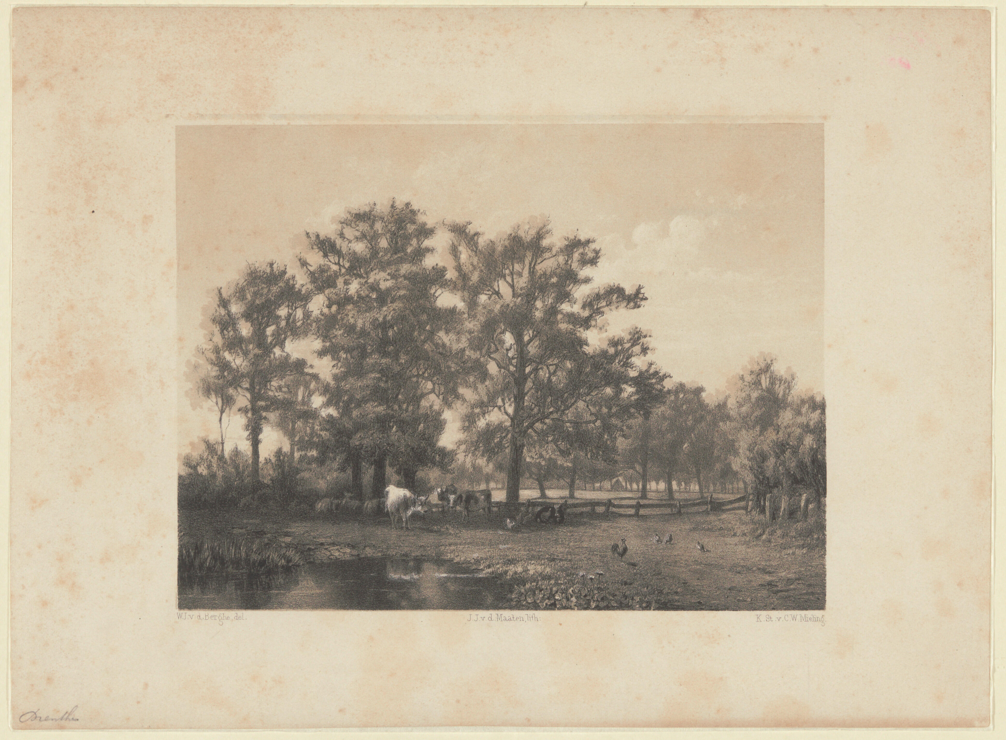 Prent, gedrukt in lithografie, van een landschap met koeien op het landgoed Beeckesteijn in Velsen. Het werk is gemaakt in Den Haag door lithograaf Jacob Jan van der Maaten, naar een afbeelding van kunstenaar Willem Jan van den Berghe.