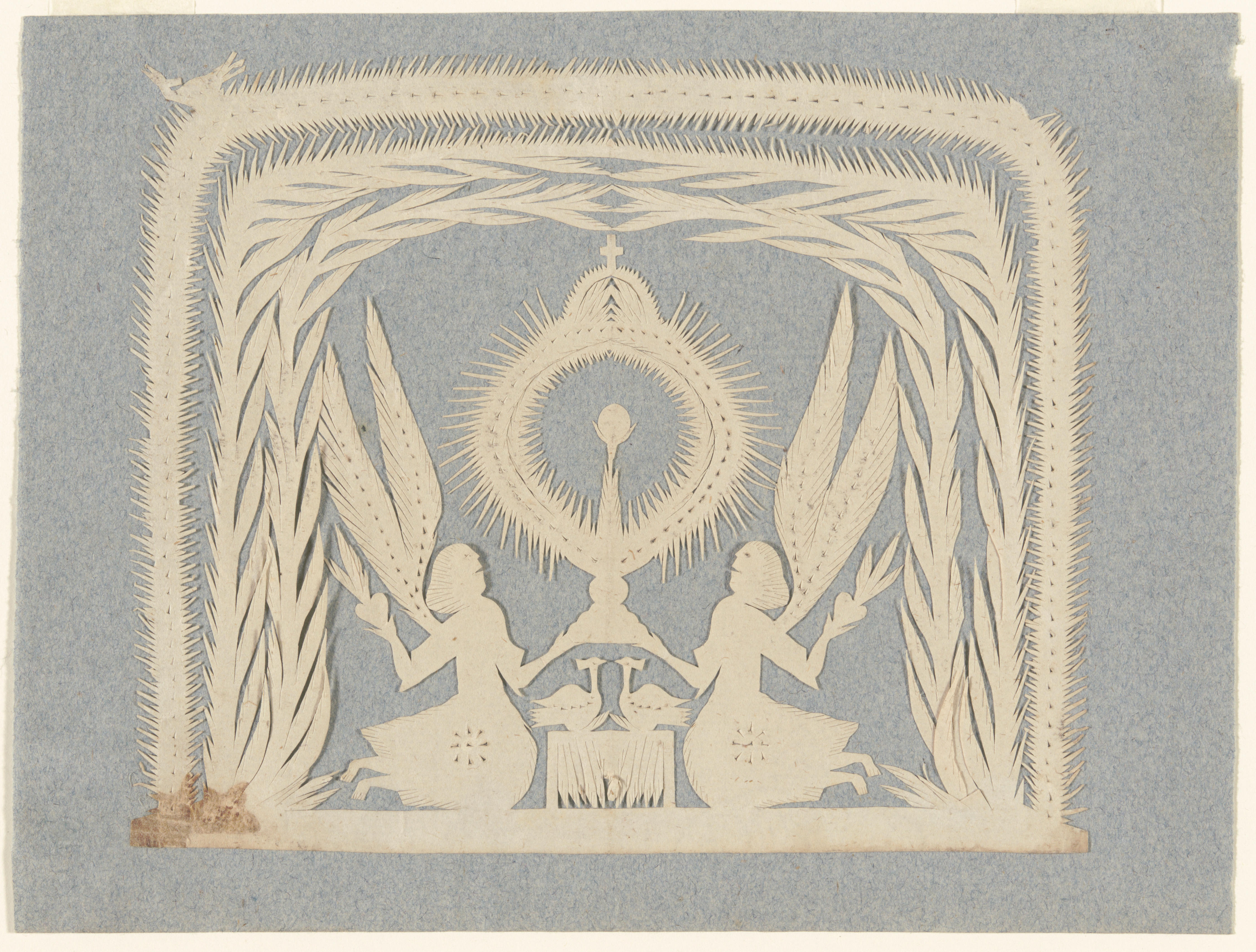 Knipsel met twee geknielde engelen die een monstrans met daarin een hostie vasthouden,omgeven door bladranken, 1800–1850