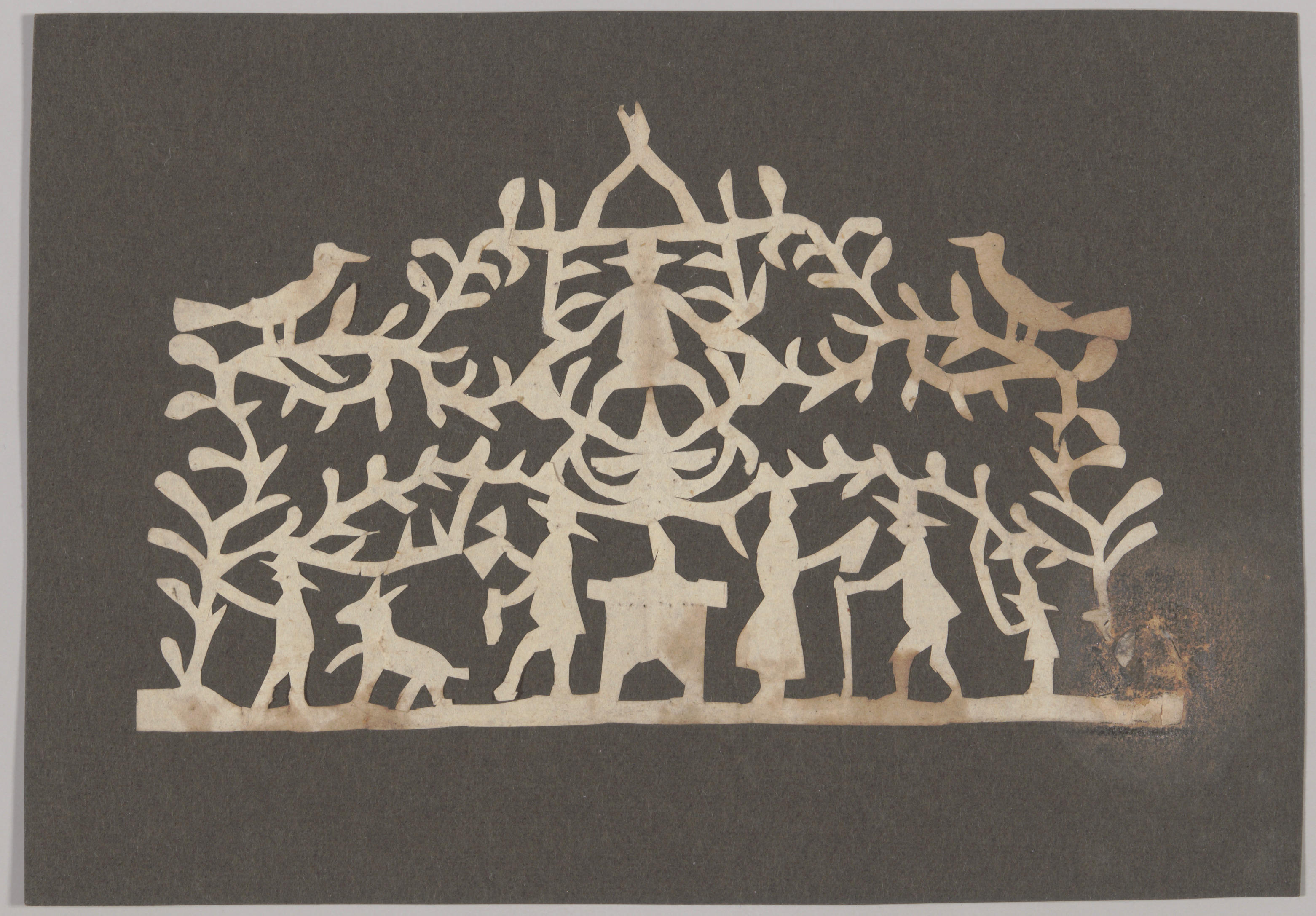 Symmetrisch knipsel met mansfiguren onder takken met vogels. Eén van de mannen krijgt een brief van een vrouw.