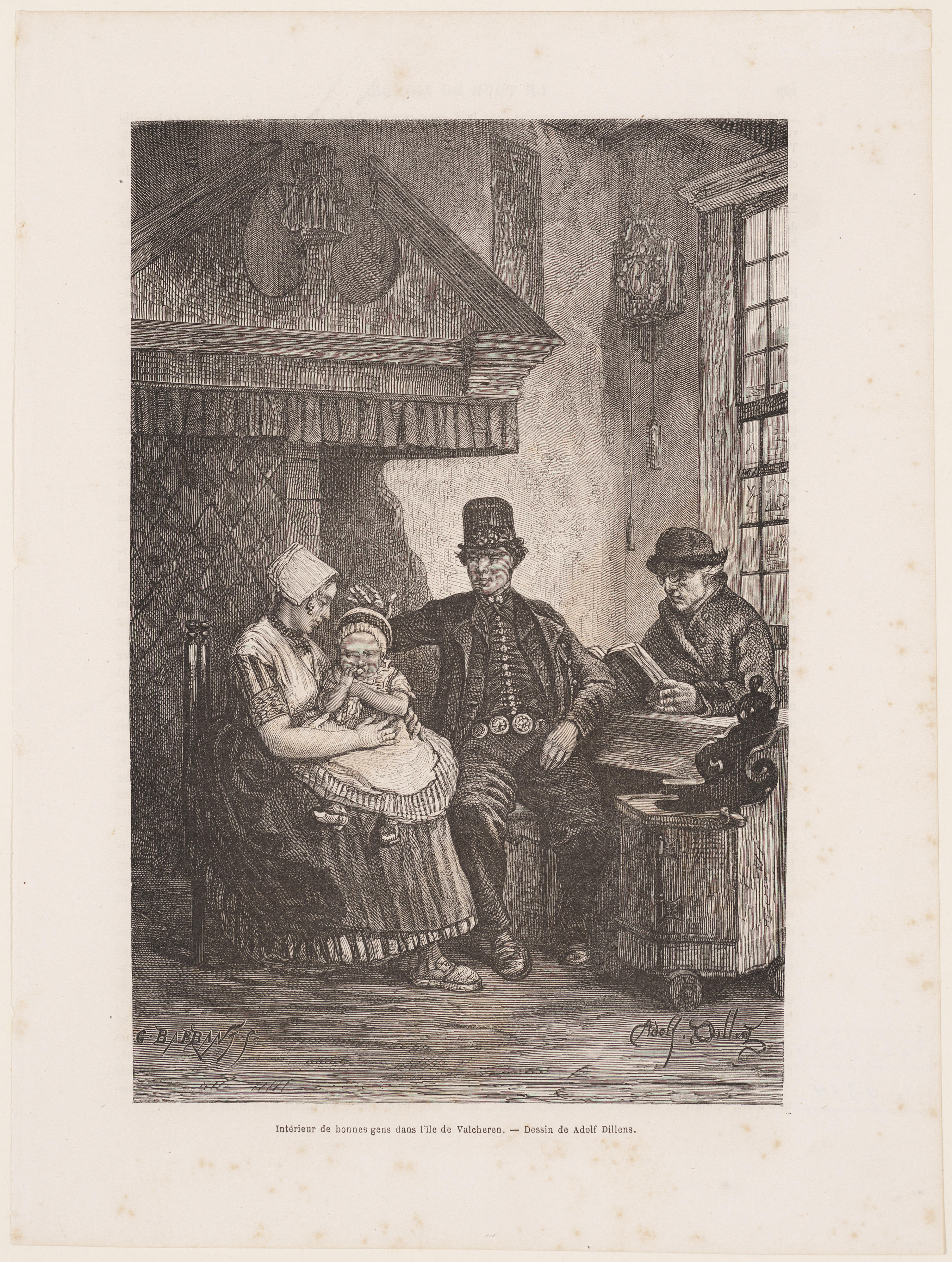 Prent van een vrouw, een kind en twee mannen in streekdracht in een woning op Walcheren.