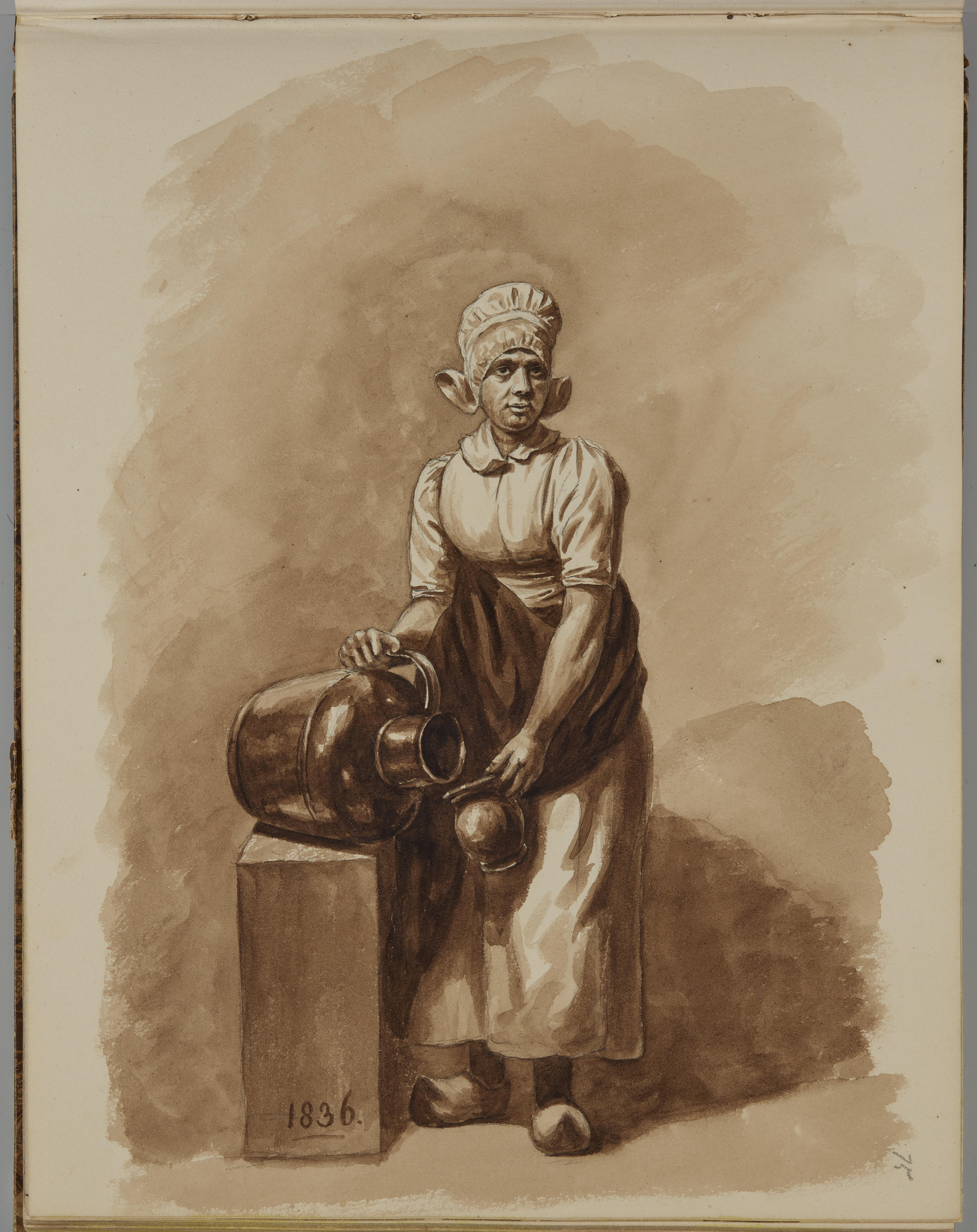 Sepiatekening van een vrouw die melk overgiet van een melkbus in een melkkan, afkomstig uit het schetsboek van J. Looyen (plaat 75).