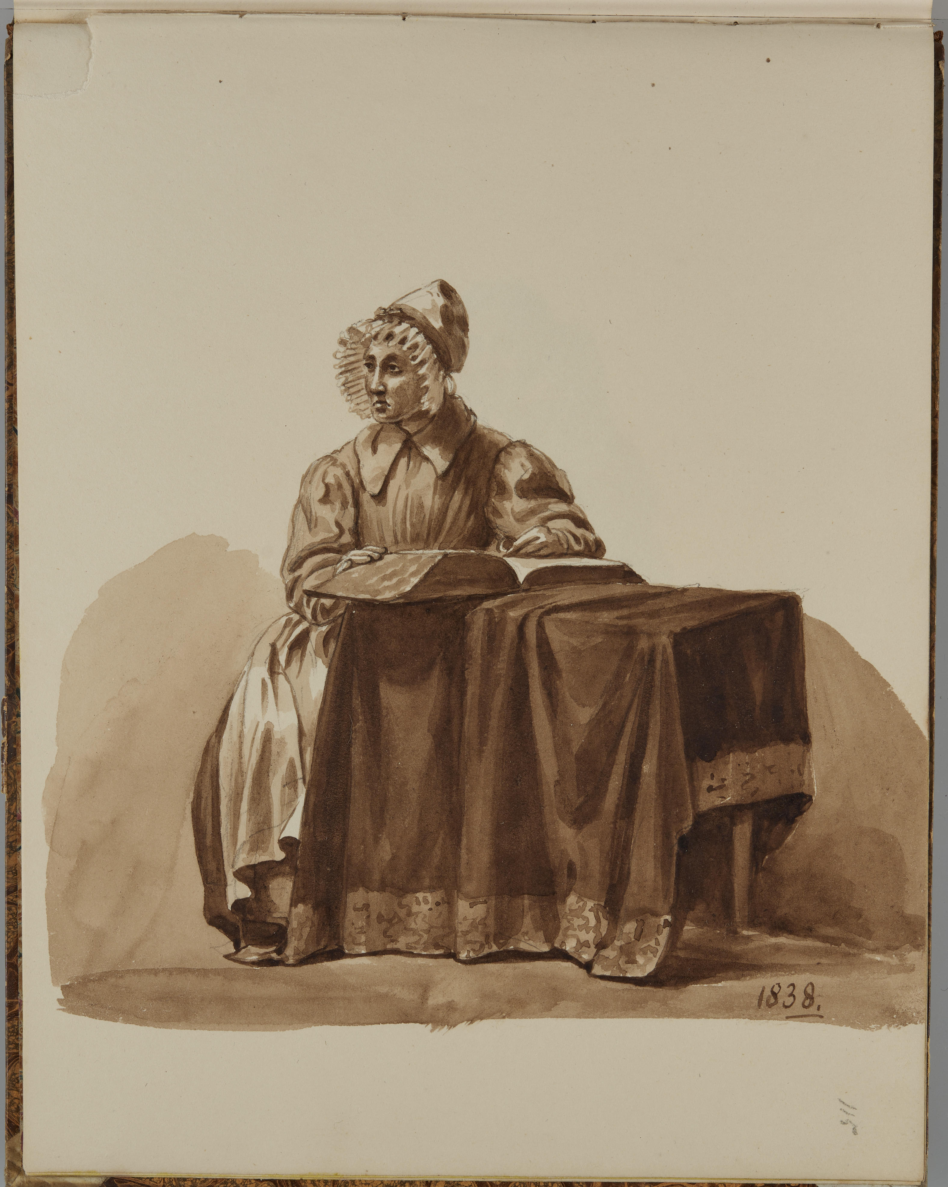Sepiatekening van een bijbellezende vrouw, afkomstig uit het schetsboek van J. Looyen (plaat 115).